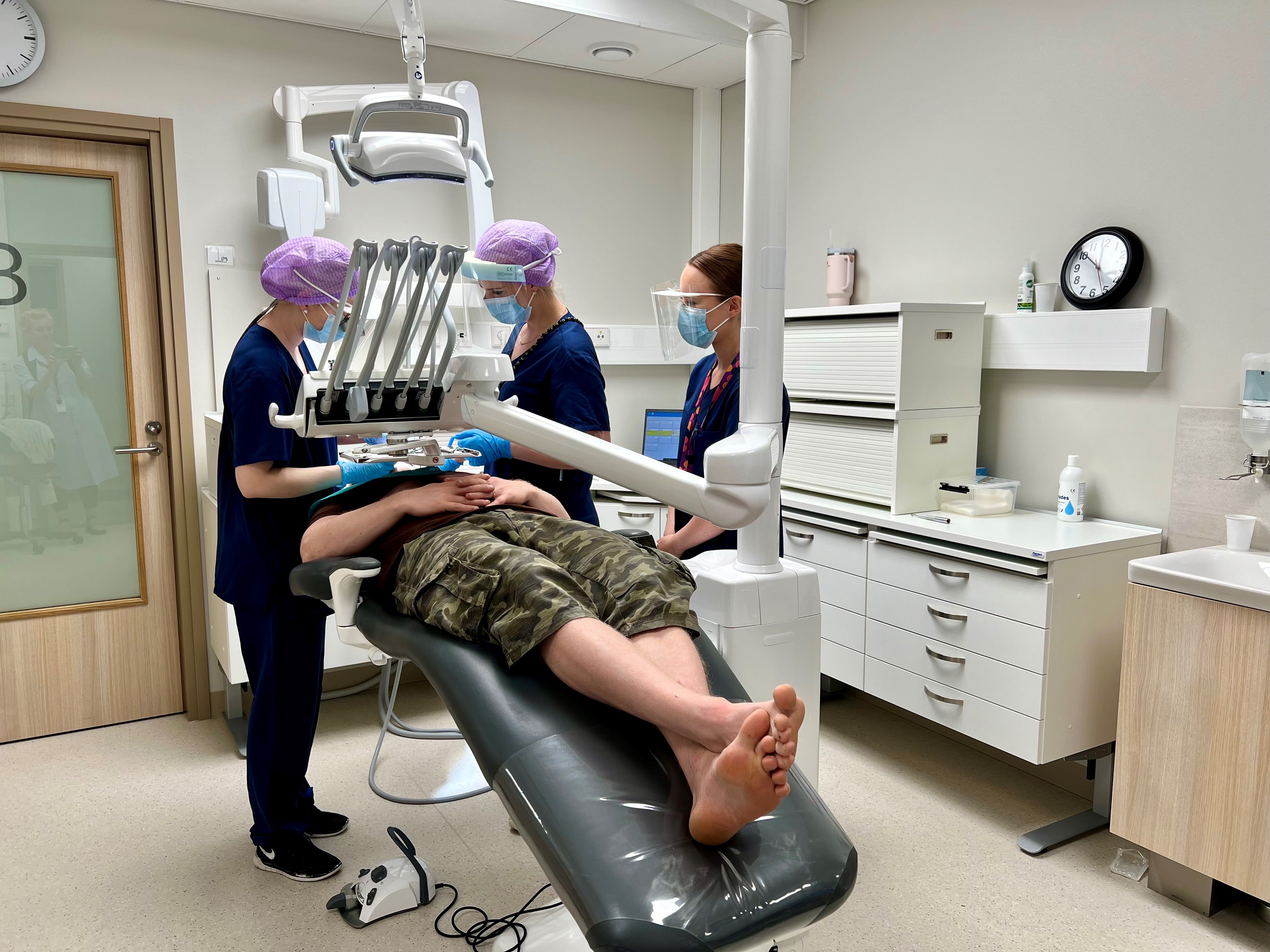 Hammashoitolan hoitohuone, jossa kolme henkilöä hoitaa tuolissa makaavan potilaan suuta.