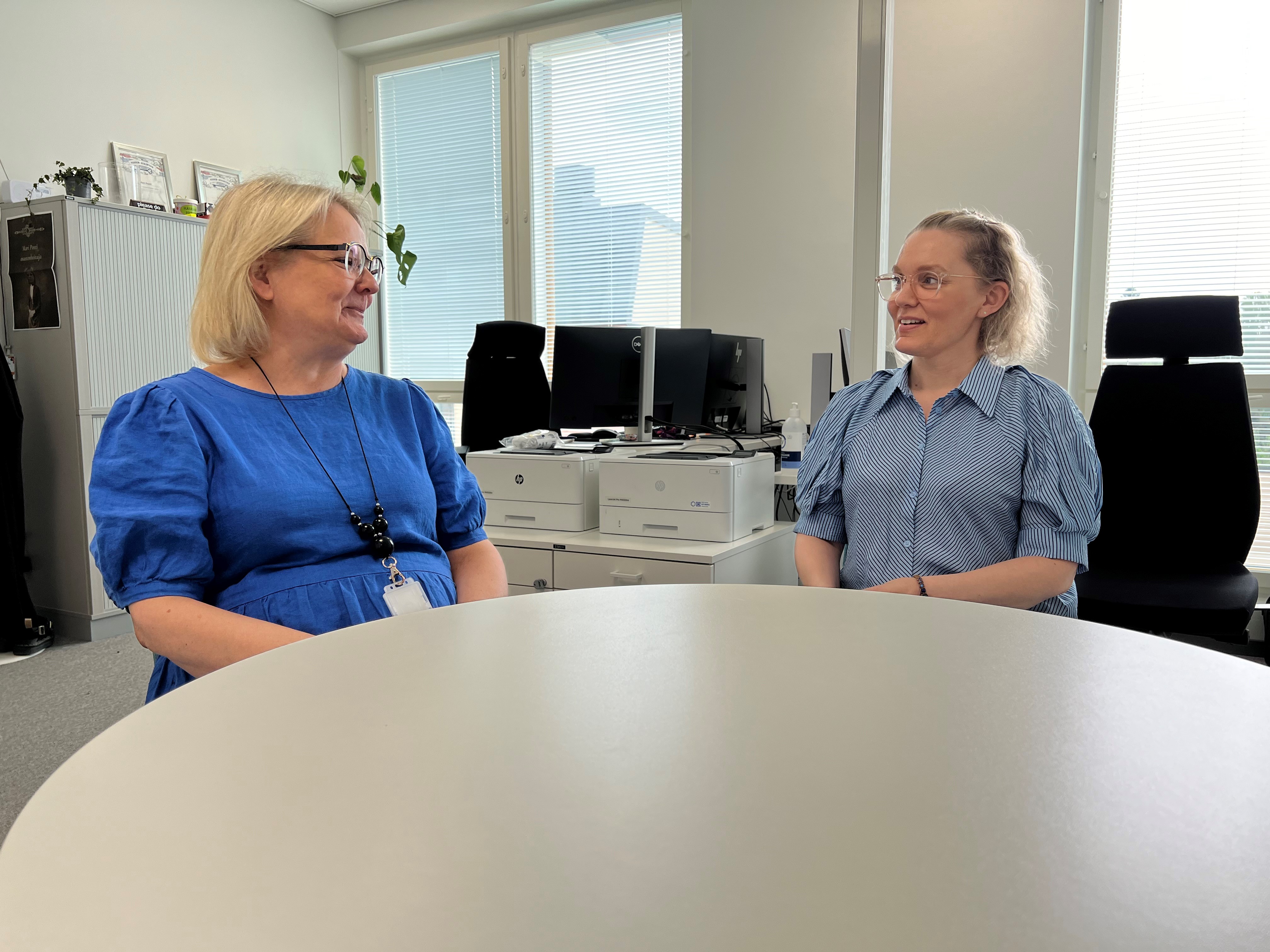 Kaksi naista istuu työhuoneessa pöydän ääressä.