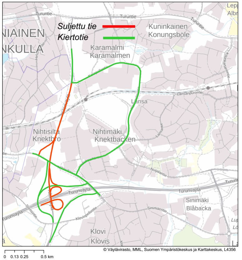 Jättebergs tunnel (Hiidenkallion tunneli) på Ring II i Esbo är stängd på nätterna mellan 10.–12.7.2024