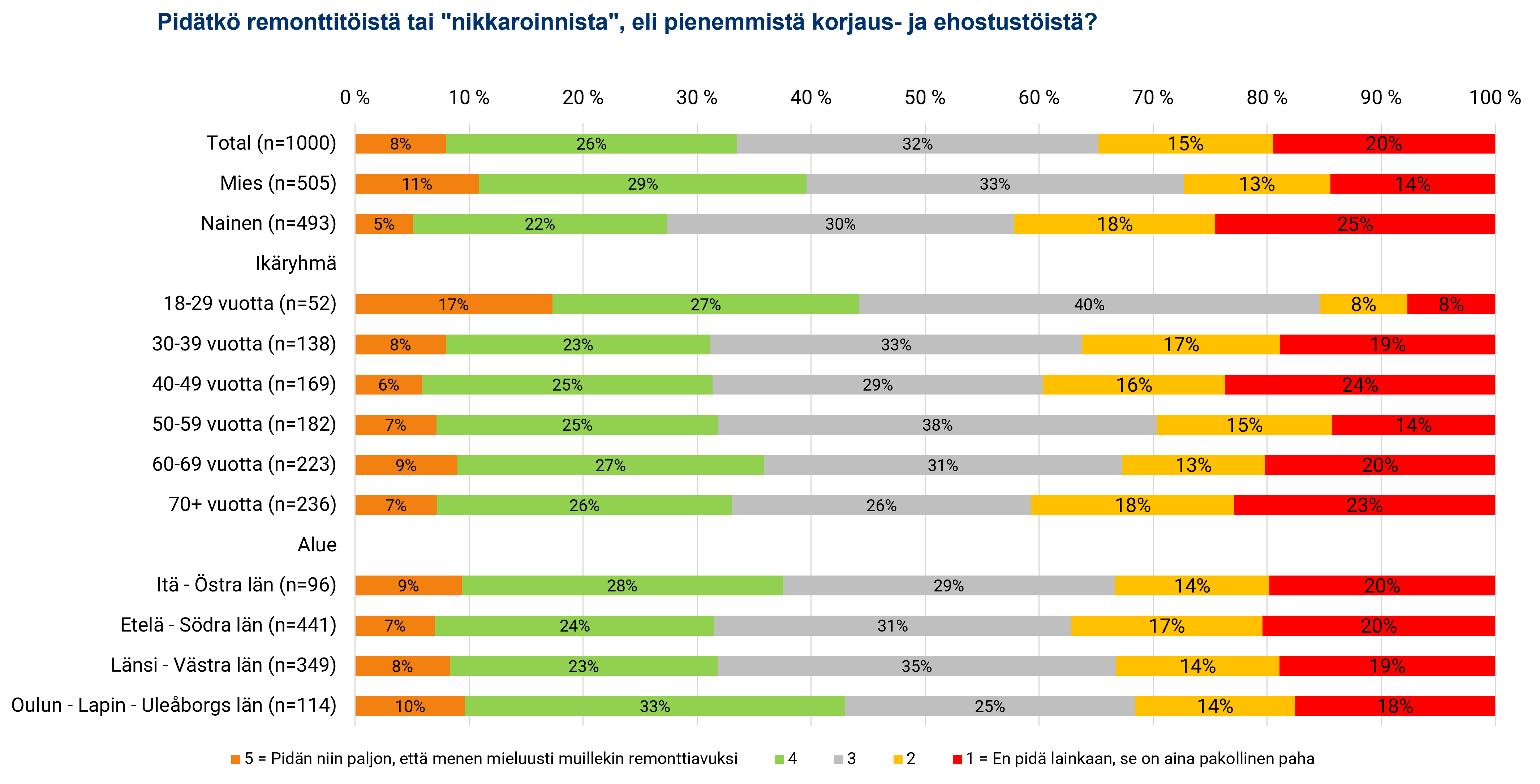 Tutkimustulosten perusteella on syytä olettaa, etteivät työkalut jää kaappiin homehtumaan. 18–29-vuotiaiden vastaajien into ryhtyä pieniin korjaus- ja ehostustöihin on nimittäin tuplasti keskivertoa korkeampi. Lähes viidesosa nuorimman vastaajaryhmän jäsenistä ilmoittaa pitävänsä remonttitöistä niin paljon, että menee mieluusti avuksi muidenkin projekteihin, kaikkien vastaajien keskiarvon ollessa 8 prosenttia. Vastaavasti vain 8 prosenttia nuorista aikuisista pitää nikkarointia pakollisena pahana, kun kaikkien vastaajien keskiarvo on 20 prosenttia.