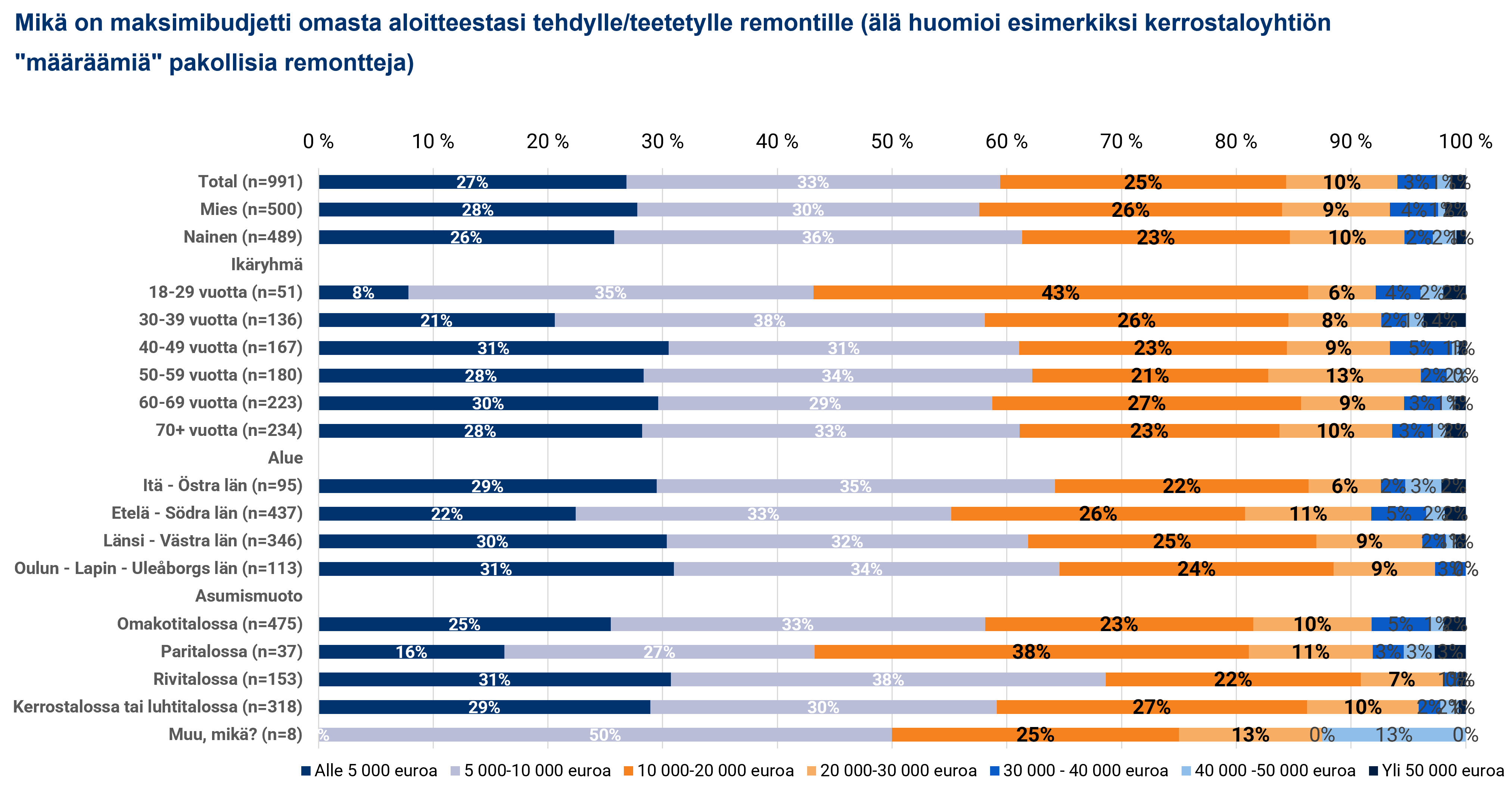 Tarkasteltaessa vastausjakaumia yksityiskohtaisemmin selviää, että rahankäyttövalmiudessaan muista erottuvat 18–29-vuotiaat aikuiset sekä paritaloasujat. Nuorista aikuisista ainoastaan 8 prosenttia ilmoittaa kodin remontin kipurajakseen 5 000 euroa, yleisimmän (43 %) vaihtoehdon ollessa 10 000–20 000 euroa. Ikäryhmän, asuinalueen ja asumismuodon perusteella jaotelluista alaryhmistä paritaloasujat ovat nuorten lisäksi ainoa, jossa 10 000–20 000 euron maksimibudjetti nousee suosituimmaksi vaihtoehdoksi.