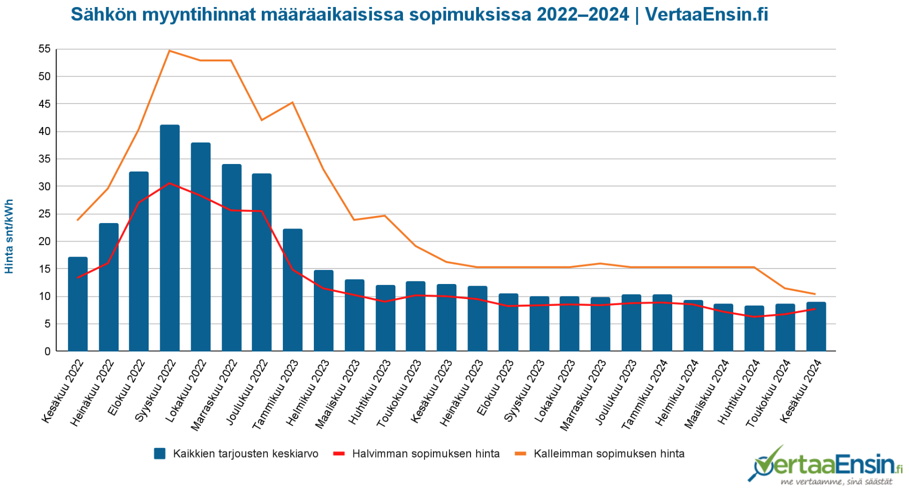 VertaaEnsin.fi-palvelun sähkömarkkinakatsauksen mukaan kiinteähintaiset ja määräaikaiset sähkösopimukset olivat suomalaisten suosituin sopimustyyppi tammi–kesäkuussa 2024. Kiinteähintaiset sähkösopimukset olivat keväällä halvimmillaan yli kahteen vuoteen, mutta toukokuusta alkaen näiden sopimusten hinnat ovat olleet nousussa.