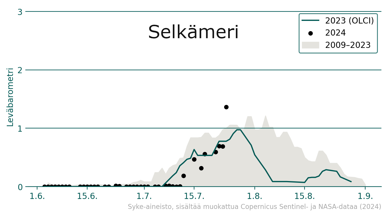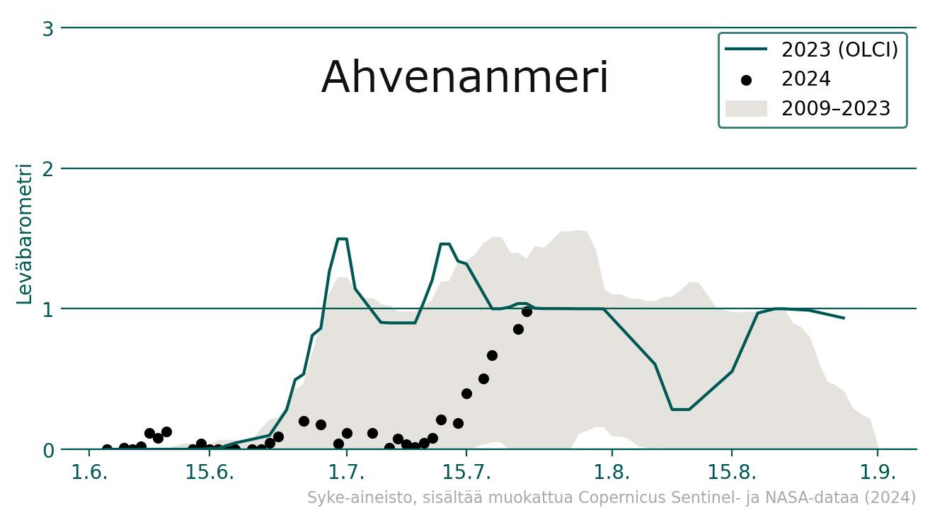 Avomerialueiden sinilevätilannetta voi seurata satelliittiaineistosta koostettujen leväbarometrien avulla. Barometrissa kuluvan vuoden havainnot on merkitty mustina pisteinä, vuosien 2009–2023 vaihteluväli näkyy vaalean harmaana (90 % satelliittihavainnoista) ja vuoden 2023 havainnot vihreänä viivana. Barometrin mukaan Ahvenanmerellä sinileväkukintoja on esiintynyt merkittävästi vähemmän alkukesän aikana kuin samaan aikaan vuonna 2023, ja kukintojen määrä on noussut vasta heinäkuun puolen välin jälkeen vuoden 2023 tasolle. Selkämerellä alkukesä oli samankaltainen kuin vuonna 2023, mutta kuluvalla viikolla sinileväkukintojen määrä ylittää sekä edellisvuoden että vuosien 2009–2023 vaihteluvälin.