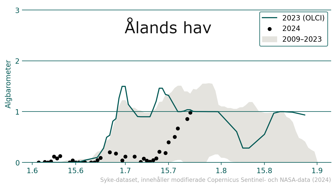 Diagram 1: Barometer för cyanobakterier i Ålands hav.  Enligt barometern har det förekommit betydligt färre blomningar av cyanobakterier i Ålands hav under försommaren än samma tid år 2023, och antalet blomningar har först efter mitten av juli stigit till 2023 års nivå. Observationspunkterna beskriver medelvärdet av observationerna av cyanobakterier i området.  0 = inga cyanobakterier, 1 = eventuella cyanobakterier, 2 = sannolikt cyanobakterier och 3 = säkert cyanobakterier. Copernicus Sentinel- & NASA-data, Syke (2024)