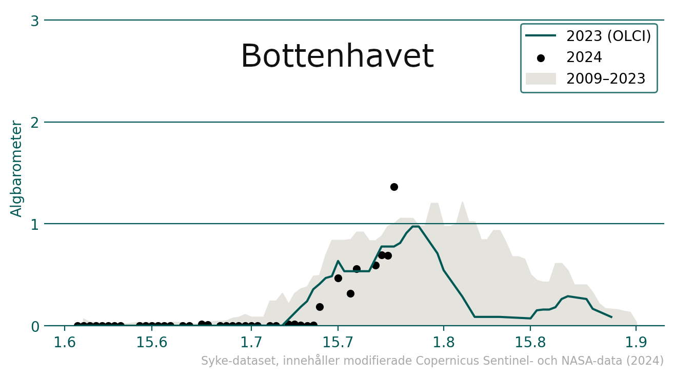 Diagram 2: Barometer för cyanobakterier i Bottenhavet.  I Bottenhavet var blomningarna av cyanobakterier i början av sommaren likadan som 2023, men under innevarande vecka överskrider mängden blomningar variationsintervallet både året innan och åren 2009–2023. Observationspunkterna beskriver medelvärdet av observationerna av cyanobakterier i området. 0 = inga cyanobakterier, 1 = eventuella cyanobakterier, 2 = sannolikt cyanobakterier och 3 = säkert cyanobakterier. Copernicus Sentinel- & NASA-data, Syke (2024)