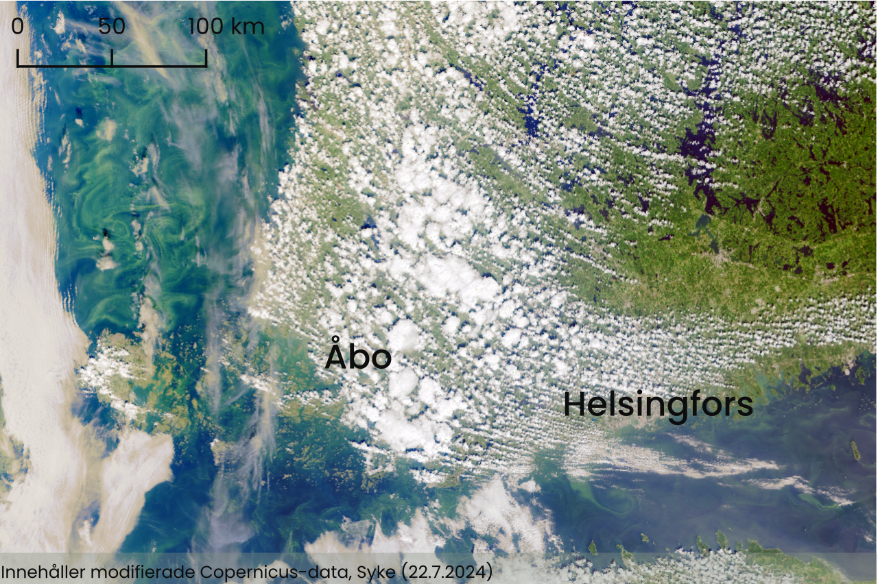 Cyanobakterier kan observeras särskilt utanför Åland och i Bottenhavet 22.7.2024.