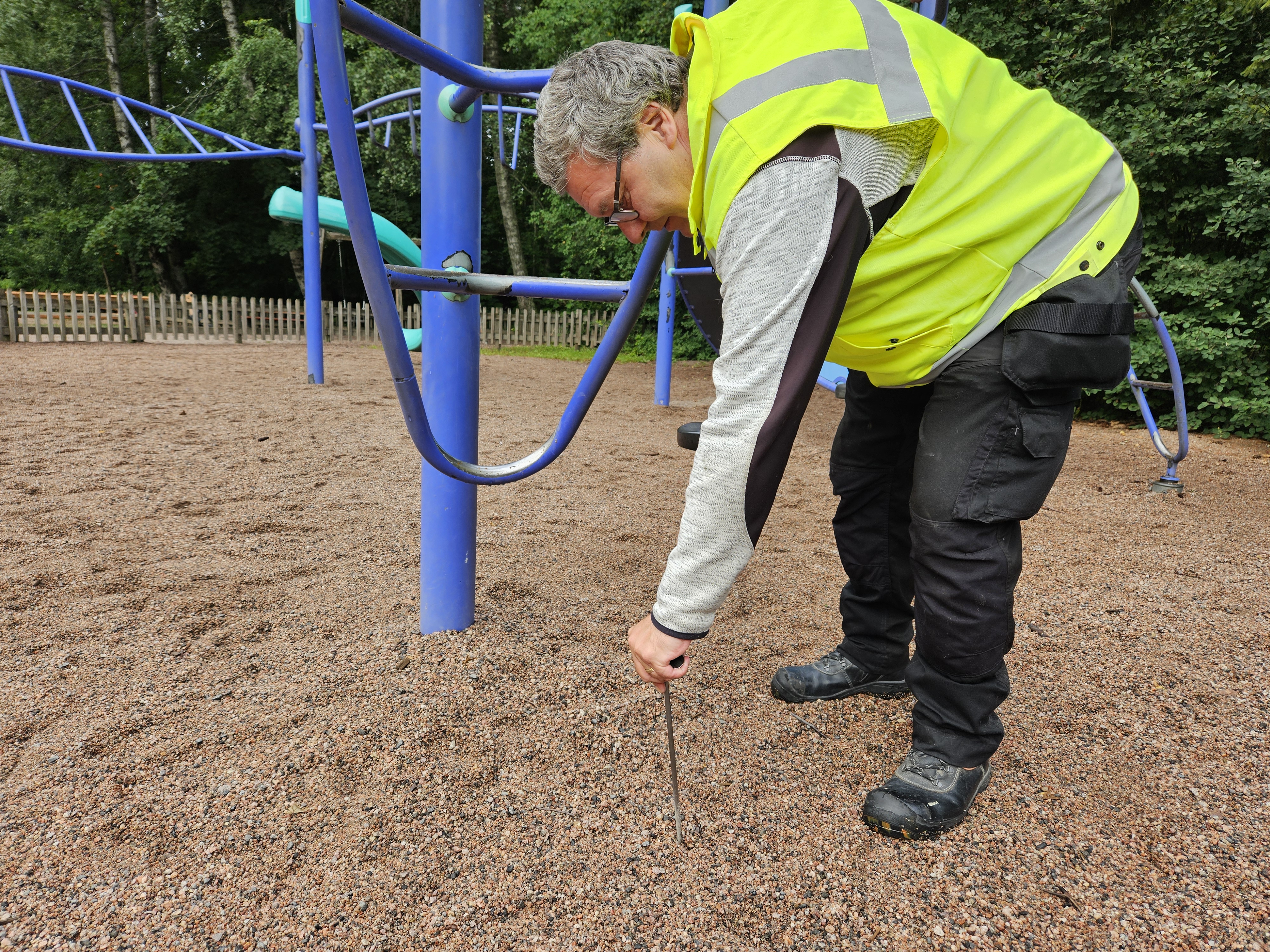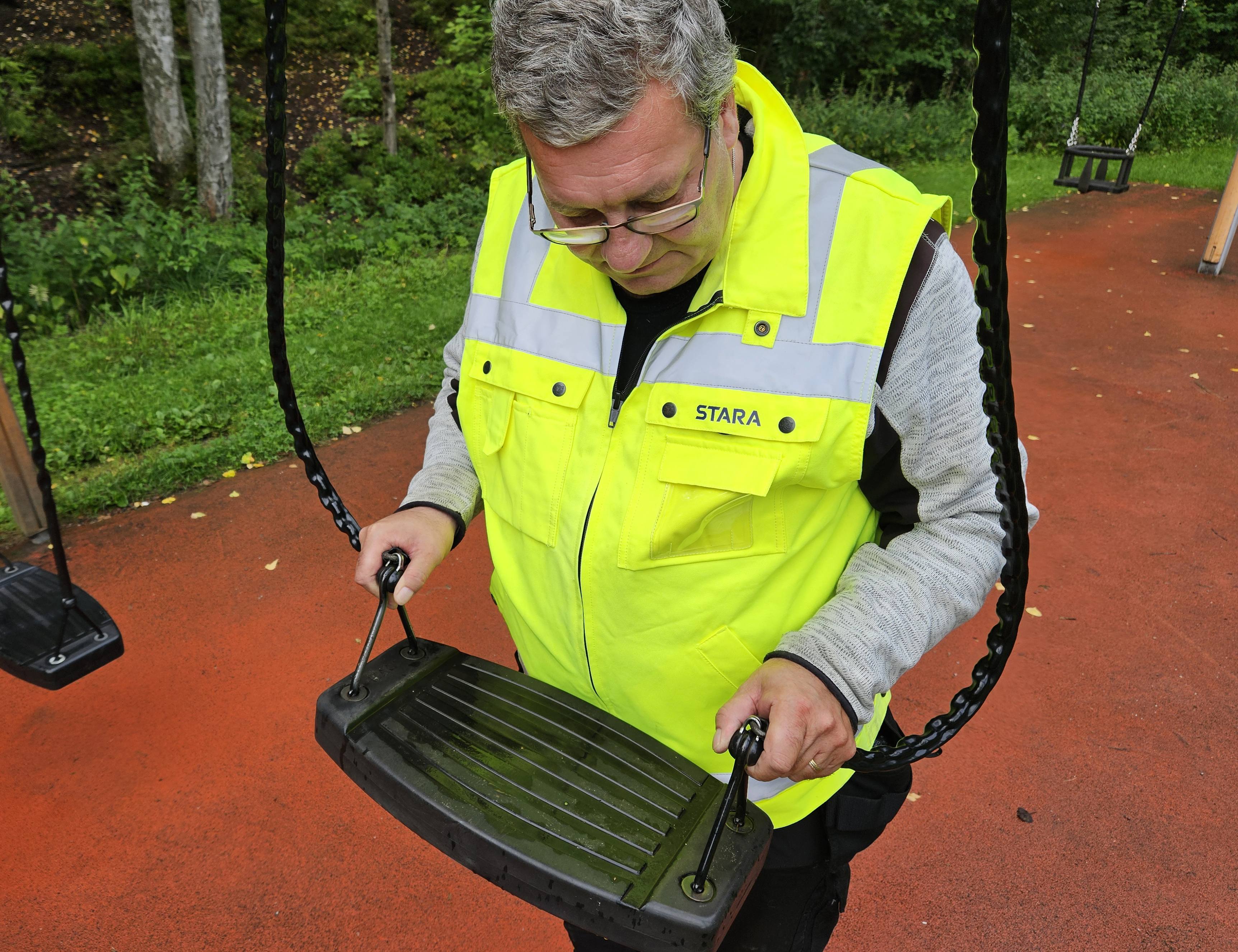 Staran leikkivälinetarkastaja Lars-Peter Bäckström kertoo, että ammattilaiset arvioivat esimerkiksi keinujen ketjujen kulumista, nyörien mahdollista takertumisvaaraa sekä sitä, onko liukumäen poistumisosan korko oikealla korkeudella.
