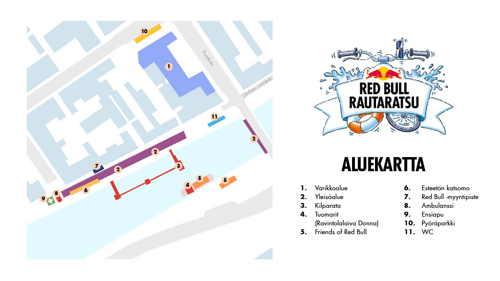 Red Bull Rautaratsut kisaavat Turun ytimessä, Läntisen Rantakadun puoleisella jokirannalla. Yleisöllä on myös mahdollisuus tutustua rautaratsuihin ja osallistuviin tiimeihin varikkoalueella Turun kaupungintalon aukiolla. Tapahtuma-alue avautuu lauantaina 10.8. kello 10.00 ja kisa alkaa kello 11.00.
