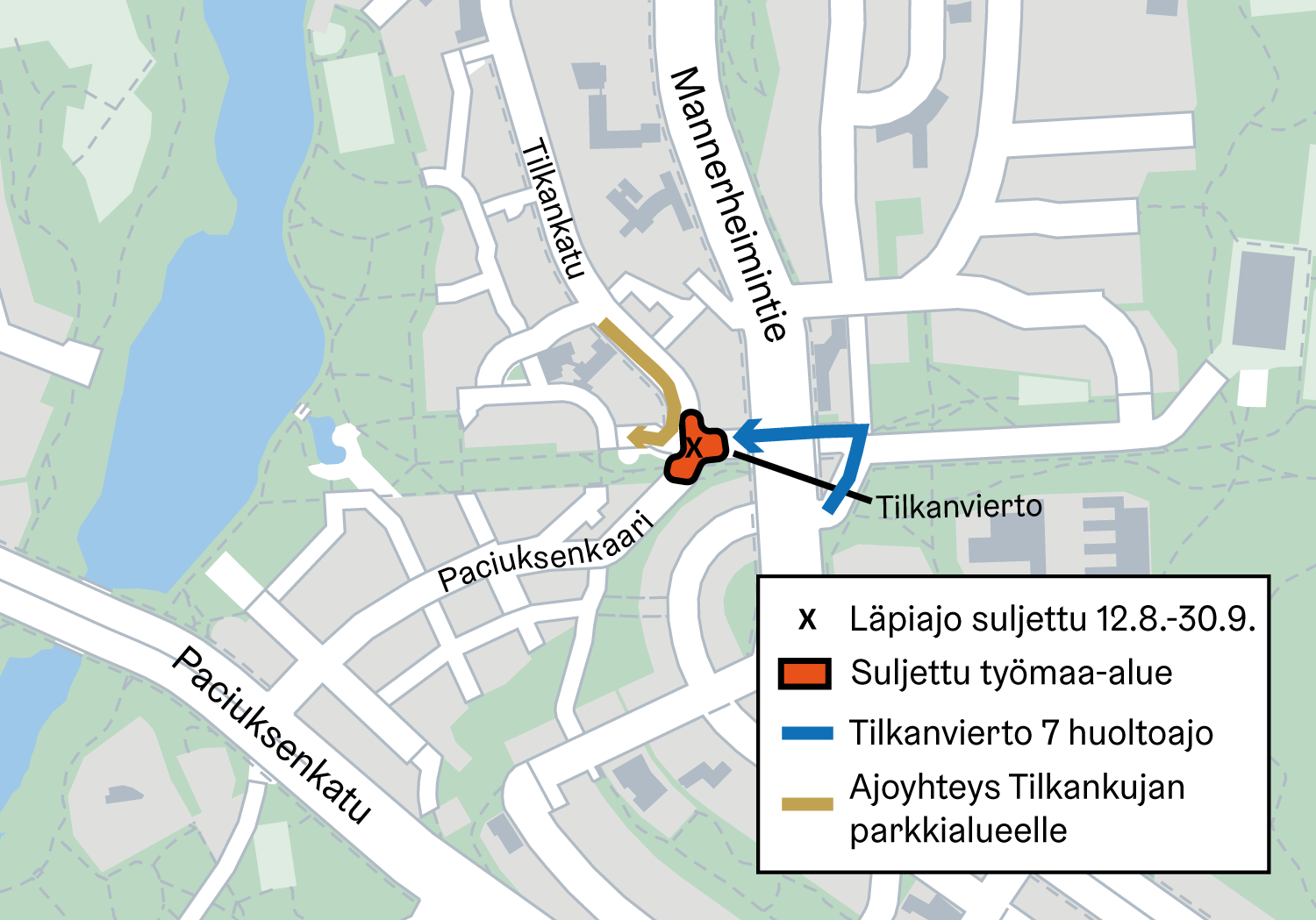 • Paciuksenkaari suljetaan liikenteeltä Tilkankadun ja Tilkanvierron risteyksessä. Moottoriajoneuvojen läpiajo Paciuksenkaarelta Tilkankadulle on suljettuna 12.8.-30.9.2024.