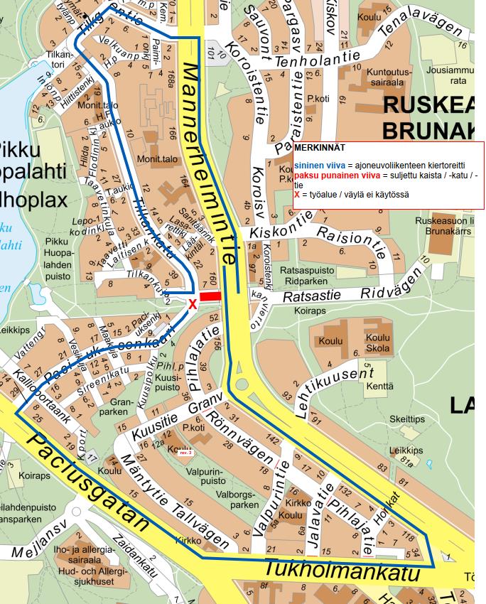 • Aikaisemmin suljettu Tilkanvierto pysyy suljettuna Mannerheimintien alittavan sillan kohdalta eteenpäin.