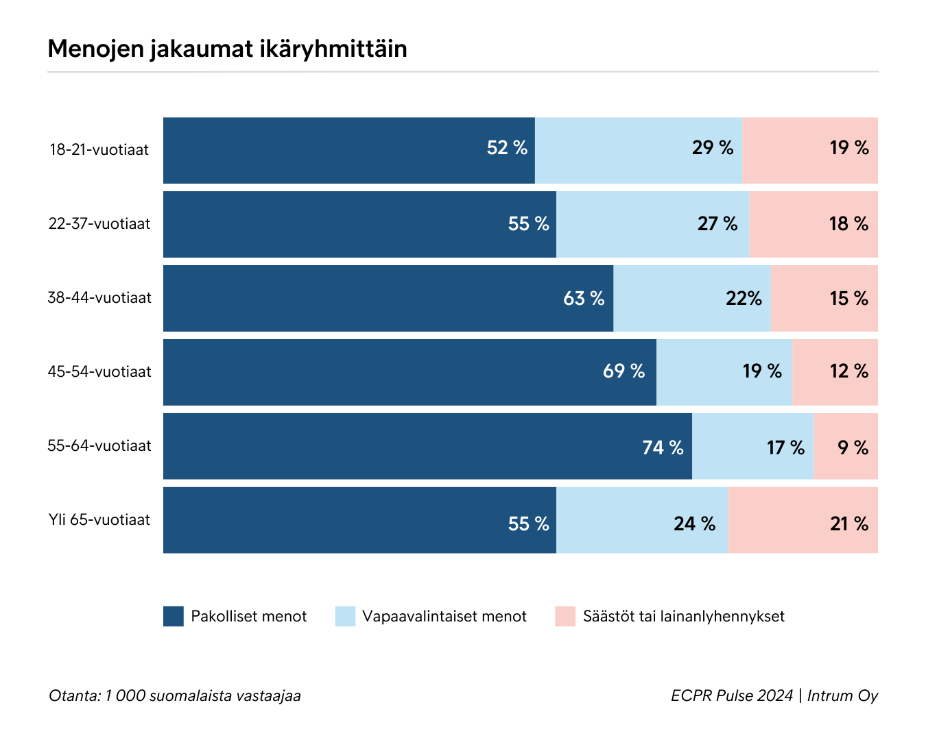 Nuorten 18-21-vuotiaiden menoista 52 prosenttia kuluu välttämättömiin kustannuksiin, 29 prosenttia vapaavalintaisiin ostoksiin ja 19 prosenttia säästöön tai lainan maksuun. Suhteessa muihin ikäryhmiin nuorten menojen jakauma on varsin terveellä pohjalla, kun sitä verrataan yleisesti suositeltuun 50-30-20 -jakaumaan, jonka mukaan enintään puolet tulisi kulua pakollisiin, 30 prosenttia vapaavalintaisiin menoihin ja 20 prosenttia säästöön tai lainan maksuun.