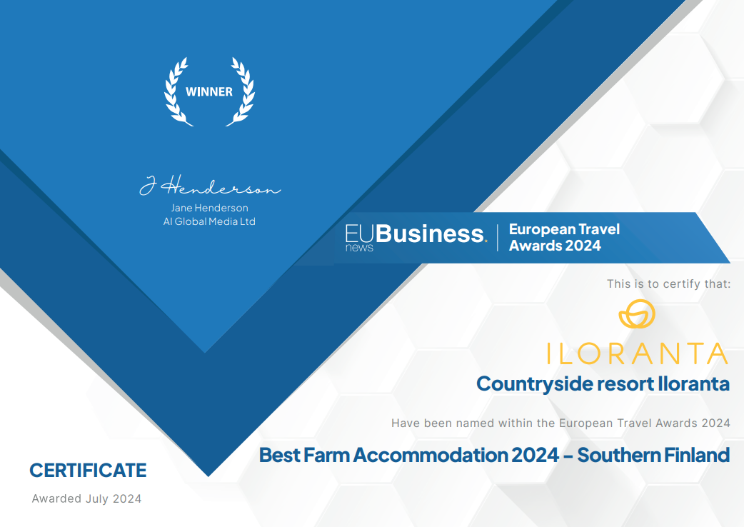 Hauholainen Iloranta on voittanut arvostetun EU Business Newsin järjestämän European Travel Awards -kilpailun kategoriassa 'Best Farm Accommodation 2024 - Southern Finland'. Jo yli 80 vuotta toiminut perheyritys osoittaa, että pienikin suomalainen maaseutumatkailukohde voi menestyä Euroopan tasolla tarjoamalla aitoja elämyksiä ja innovatiivista palvelua. Palkinto on osoitus Ilorannan pitkäjänteisestä, korkeatasoisesta ja laadukkaasta toiminnasta maaseutumatkailun saralla. Kilpailun tasosta kertoo myös se, että viime vuonna Muumimaailma palkittiin parhaana perhelomakohteena.
