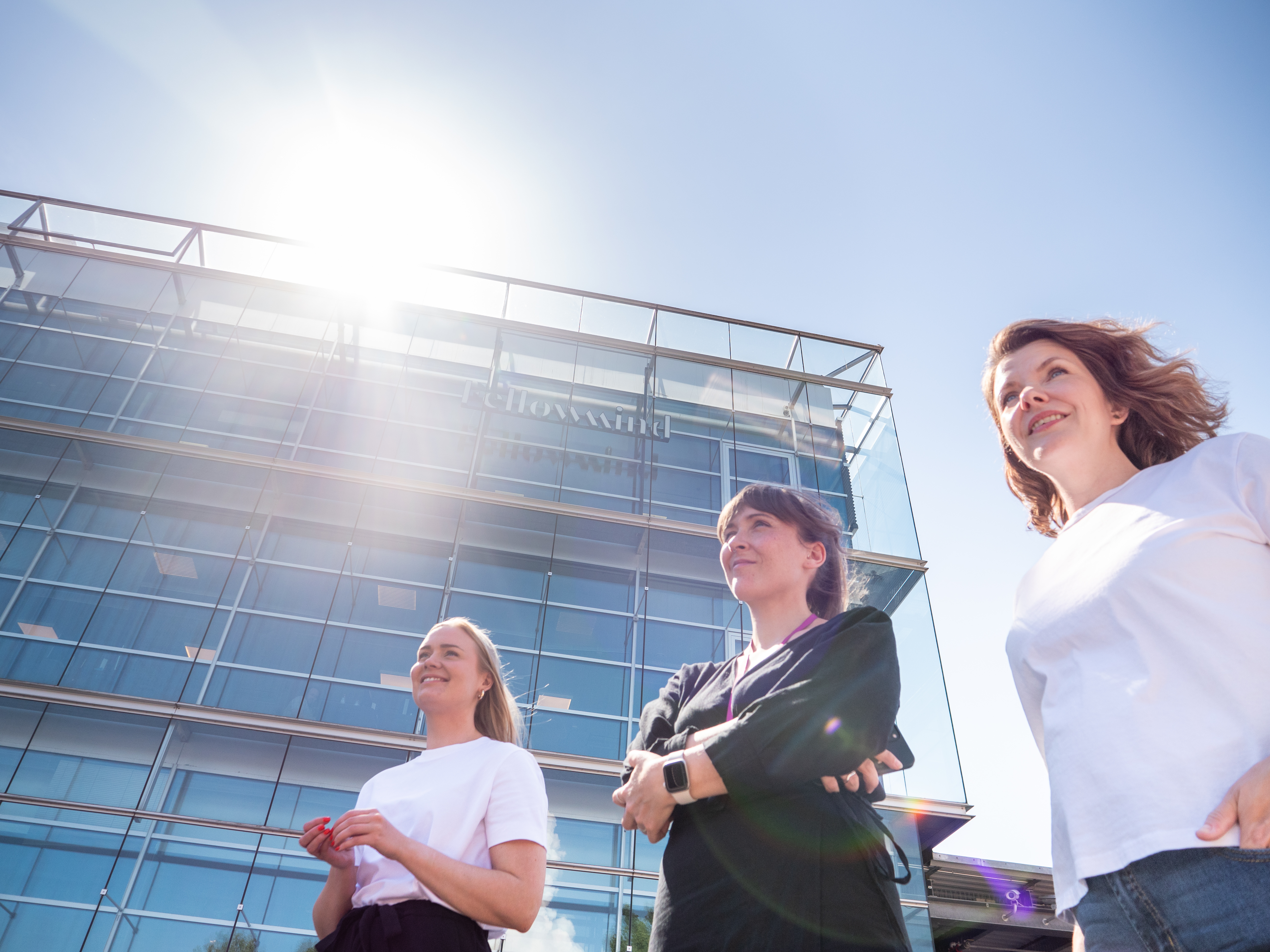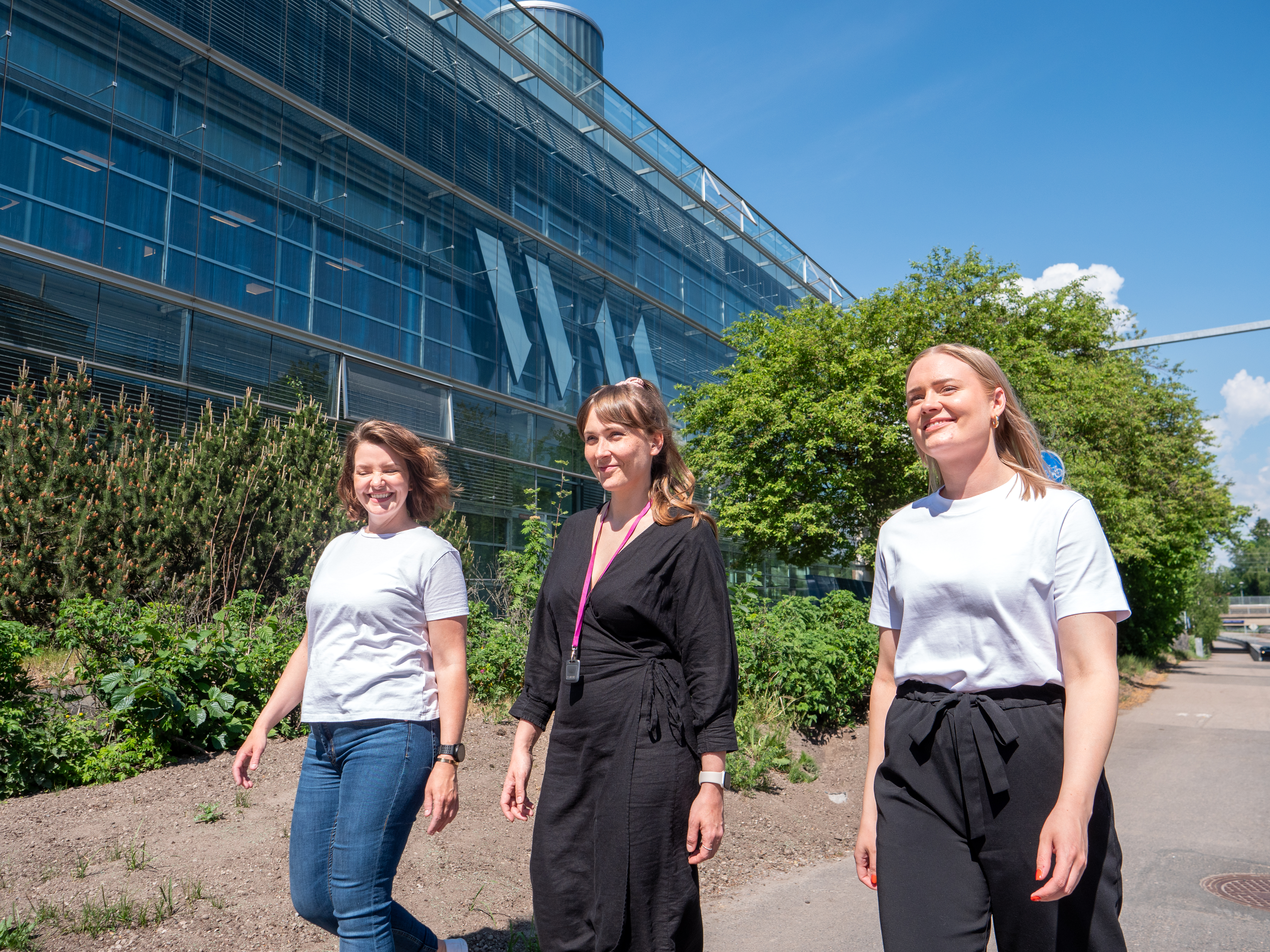 Kolme naispuolista asiantuntijaa kävelee kadulla. Taustalla näkyy Fellowmindin pääkonttorin suuri logo.
