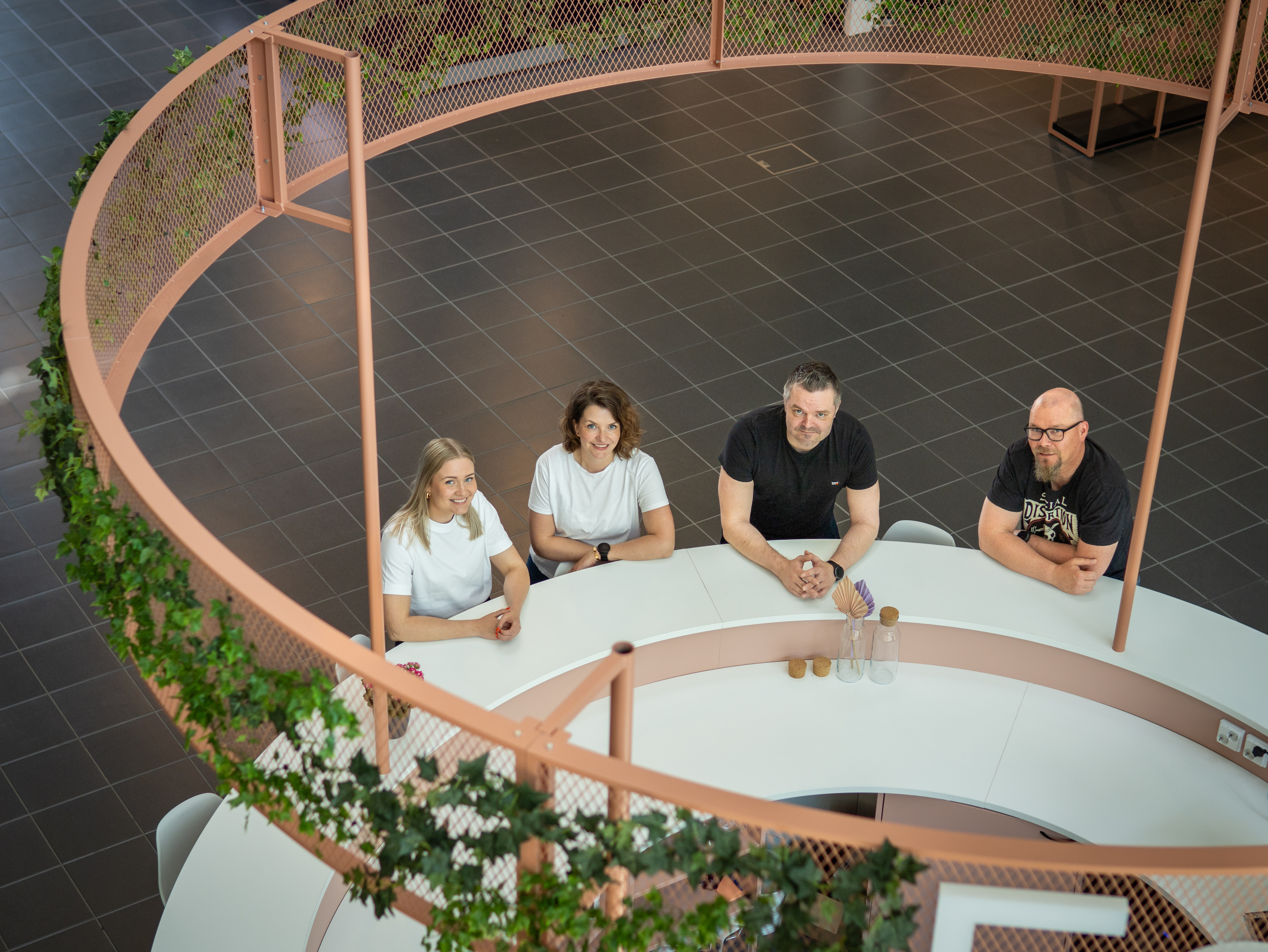 Neljä asiantuntijaa istuu kahvilan tiskin ääressä ja katsoo kohti kameraa.