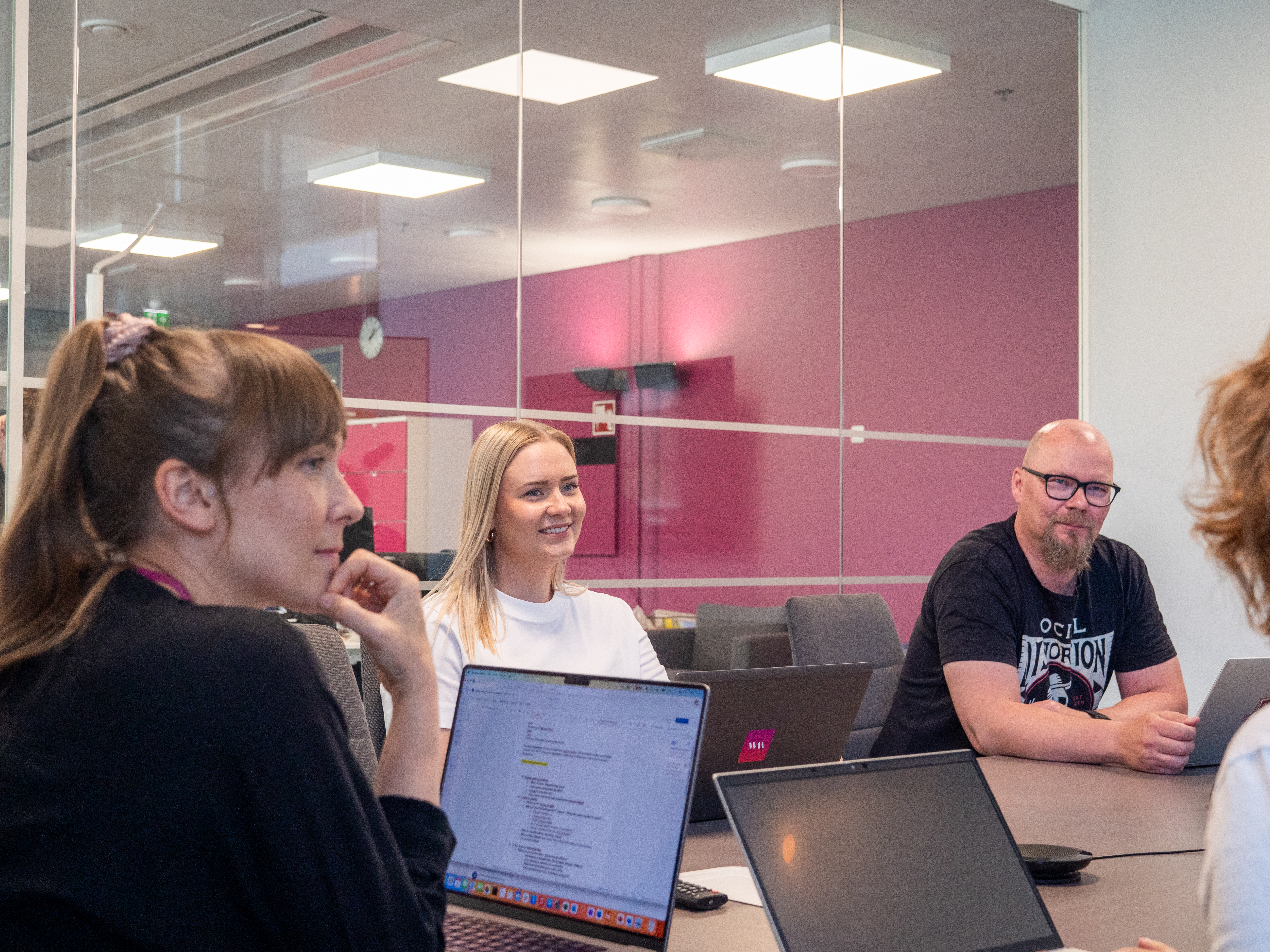 Kolme asiantuntijaa seisoo Fellowmindin pääkonttorin edessä auringon paistaessa toimiston takaa.
