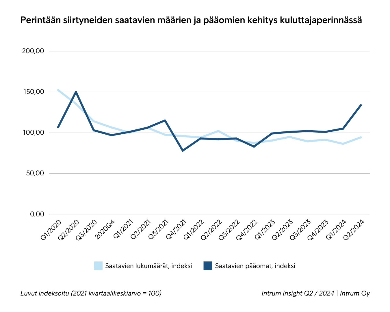 Luotonhallintayhtiö Intrumin laskunvälityksen ja perinnän analyysi kertoo, että saatavista joudutaan muistuttamaan ja niitä siirtyy perintään yhä useammin. Kuluttajaperinnässä sekä tapausten määrät että perinnässä olevat summat kasvoivat vuoden 2024 toisella neljänneksellä. Varovaisen positiivisia loppuvuoden näkymiä tukee kuitenkin perintäonnistumien kääntyminen kasvuun, mikä kertoo sekä kuluttajien että yritysten maksukyvyn vahvistumisesta.