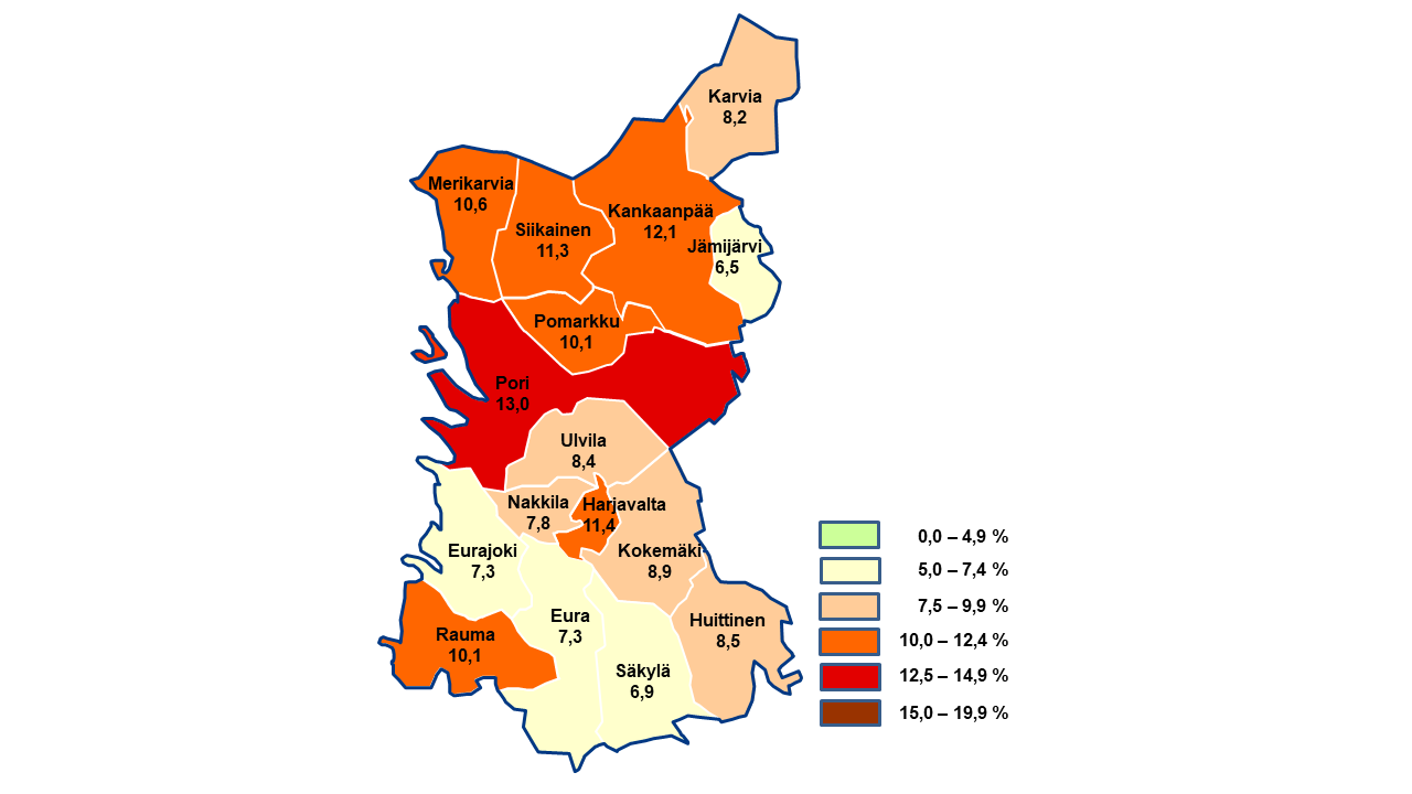 Heinäkuussa työttömyys oli korkeinta Porissa, jossa työttömien työnhakijoiden osuus työvoimasta oli 13,0 %. Alin työttömyys taas oli Jämijärvellä (6,5 %).