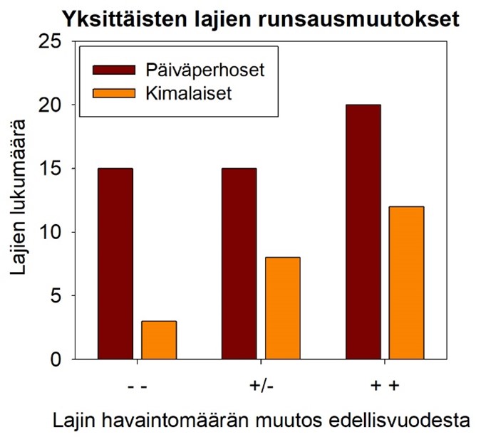 Ennakkotietojen perusteella runsastuneita päiväperhoslajeja on tänä kesänä ollut hieman enemmän kuin vähentyneitä. Noin kolmanneksella lajeista yksilömäärät olivat lähellä edellisvuoden tasoa.
