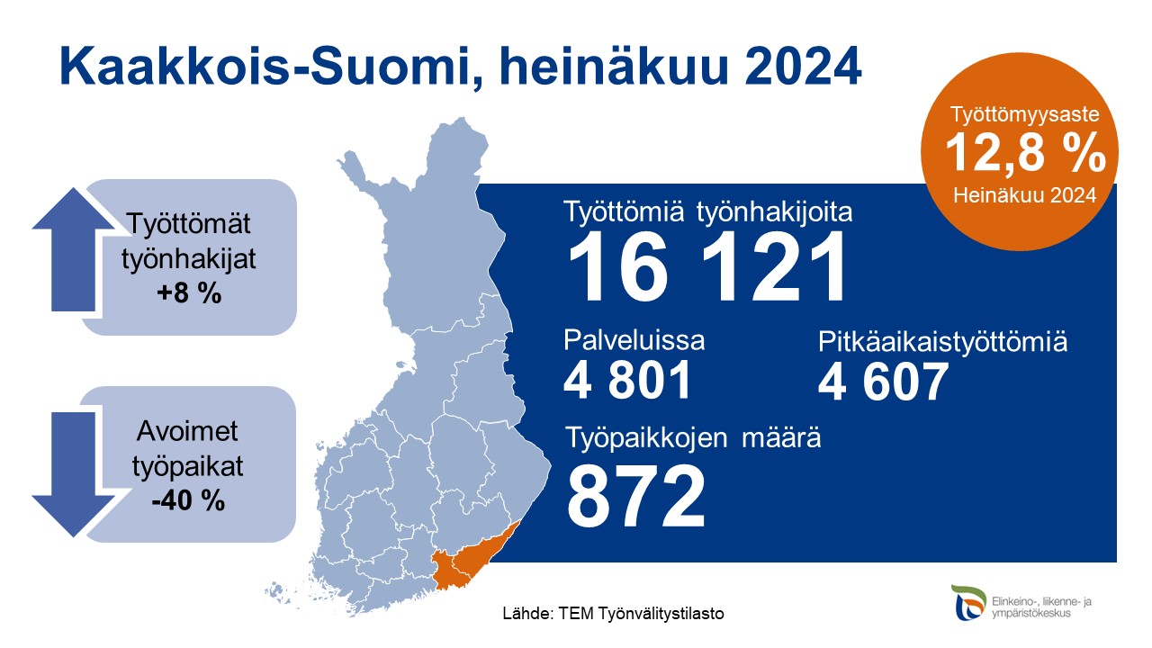 Kaakkois-Suomen työ- ja elinkeinotoimistossa oli heinäkuun lopussa 16121 työtöntä työnhakijaa. Työttömien määrä on 1216 henkilöä (+8 %) suurempi kuin vuotta aikaisemmin.
