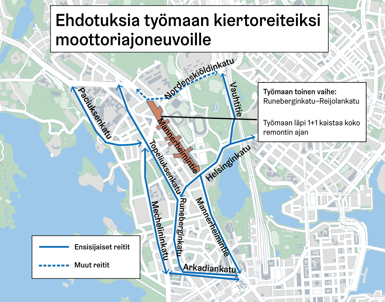 Syyskuun alussa Helsingin tähän asti suurimman katuremontin työt siirtyvät Taka-Töölöön, jossa työalueena on Mannerheimintie Runeberginkadun ja Reijolankadun välillä sekä osa sivukaduista. Mannerheimintien peruskorjaus valmistuu kokonaisuudessaan loppuvuonna 2025.