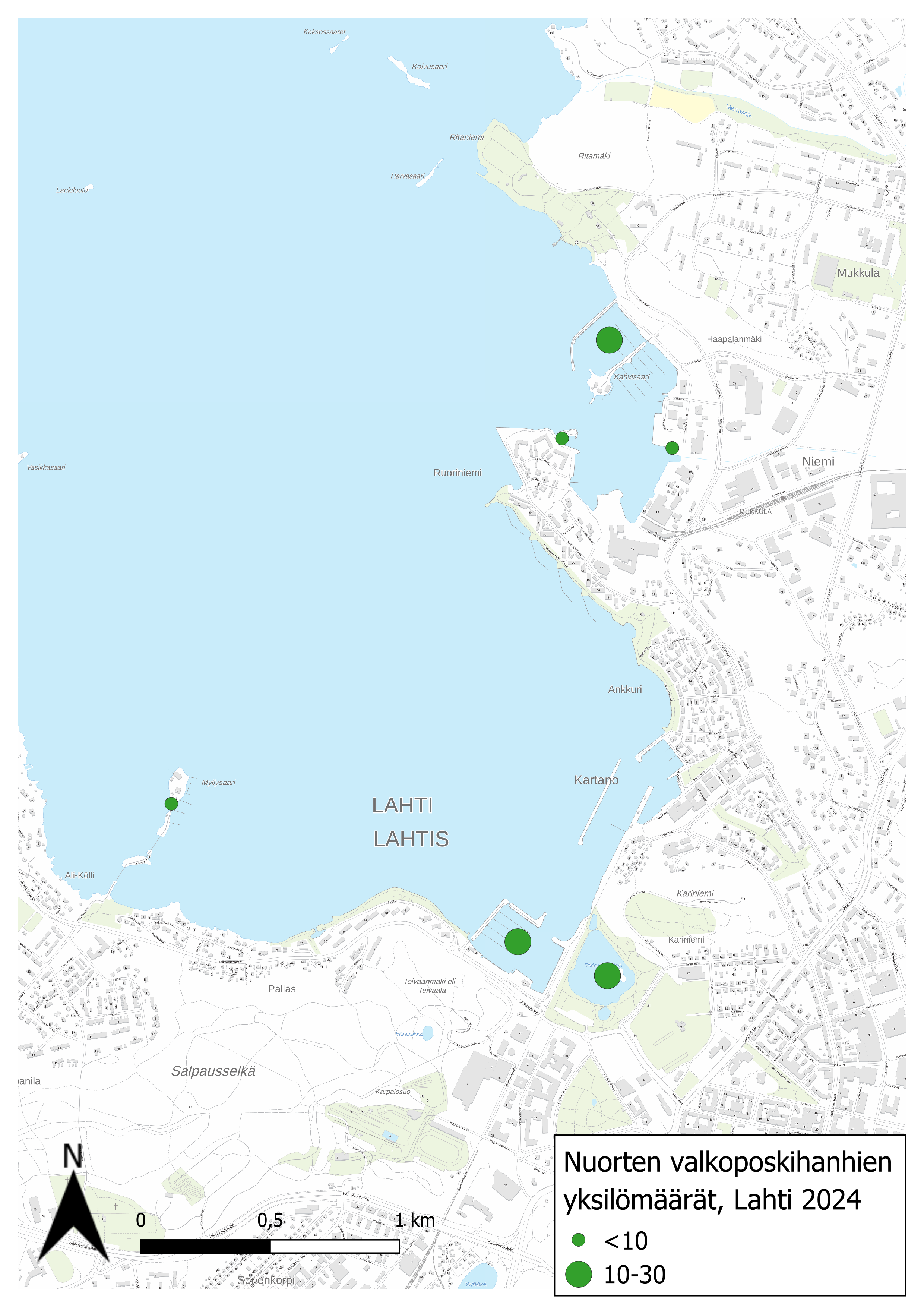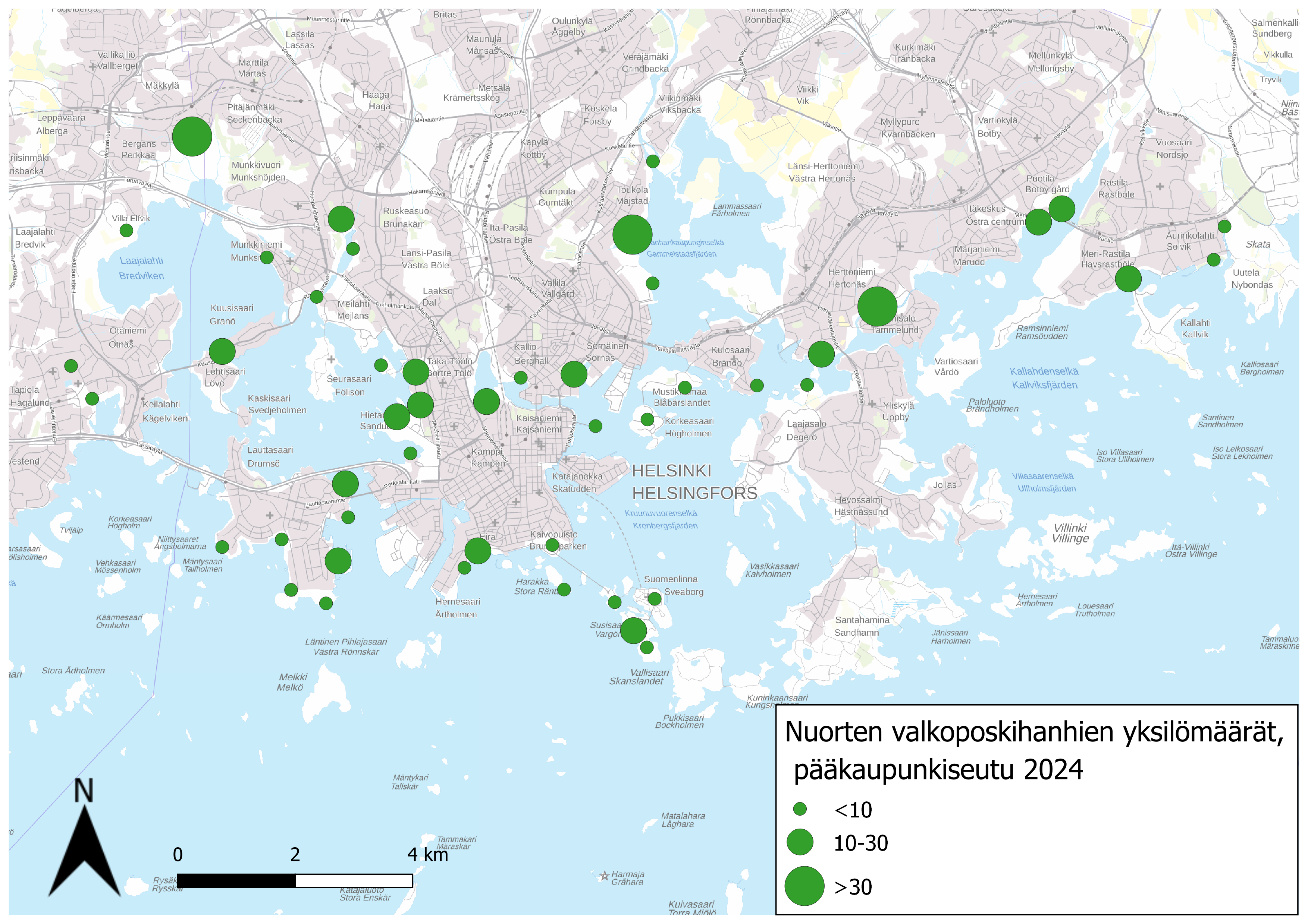 Helsingissä poikueita havaittiin eniten Suomenlinnassa, Töölönlahdella, Arabianrannassa, Lauttasaarensalmessa ja Töölön Merikannontiellä. Itä-Helsingissä suurimmat määrät havaittiin Tammisalon Porolahdella ja Herttoniemenrannassa. Itäisessä Espoossa poikueita oli eniten Vermossa.