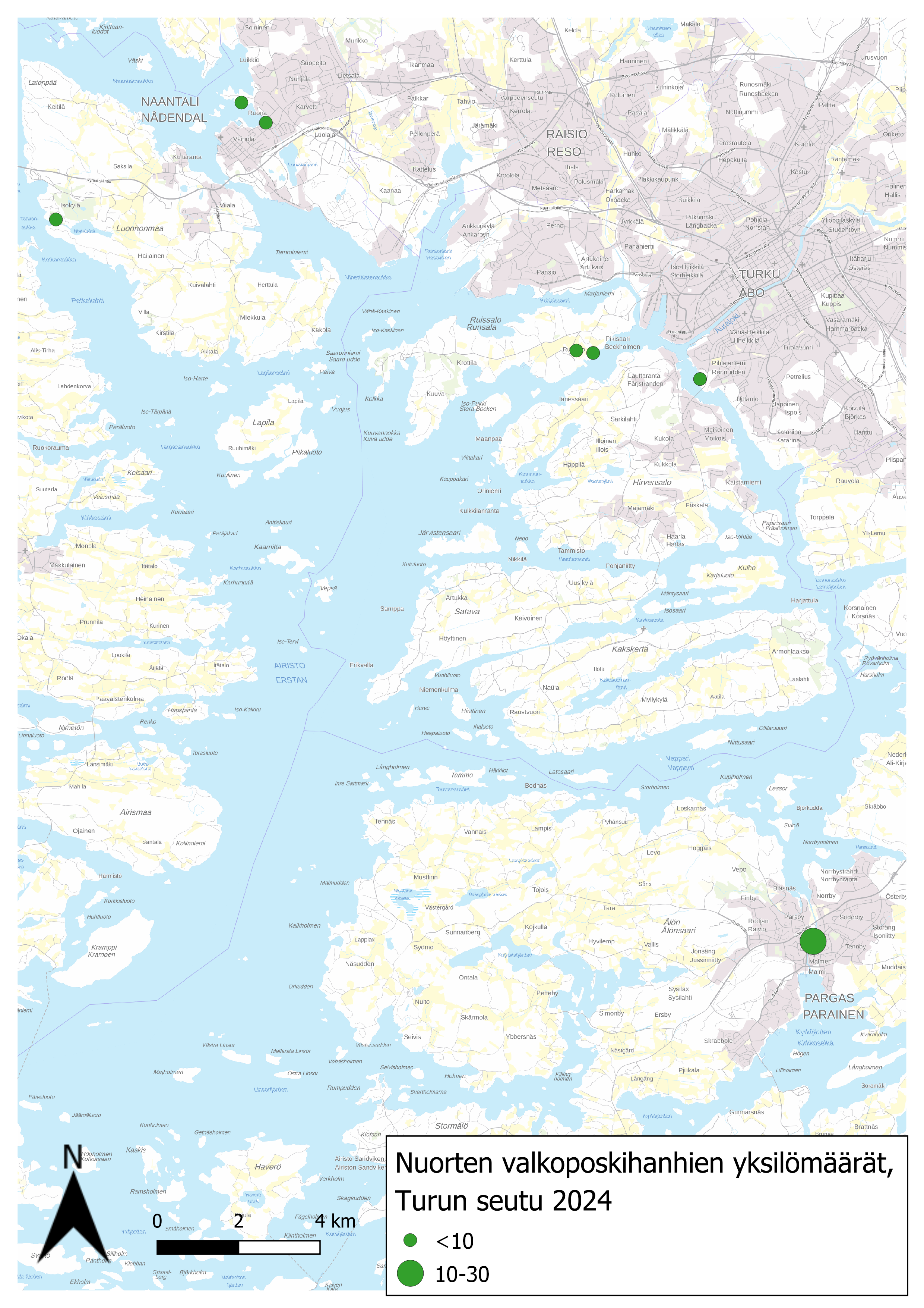 Turussa, Paraisilla ja Naantalissa hanhia havaittiin yhteensä 1004, joista poikasia oli 47. Viime vuonna tällä seuranta-alueella laskettiin hanhia yhteensä 867 joista poikasia 31, eli molempien määrä kasvoi hieman viime vuoteen verrattuna. Eniten hanhia havaittiin Naantalin kylpylällä, Paraisten Keskuspuistossa ja Kirkkopuistossa sekä Turun Ruissalossa Kansanpuiston laitumella ja Kolkassa. Poikueita havaittiin eniten Paraisten Keskuspuistossa ja Kirkkopuistossa, ja pienempiä määriä mm Turussa Ruissalon Kansanpuiston laitumella sekä Naantalissa Kylpylän ympäristössä ja Kultarannan golfkentällä.