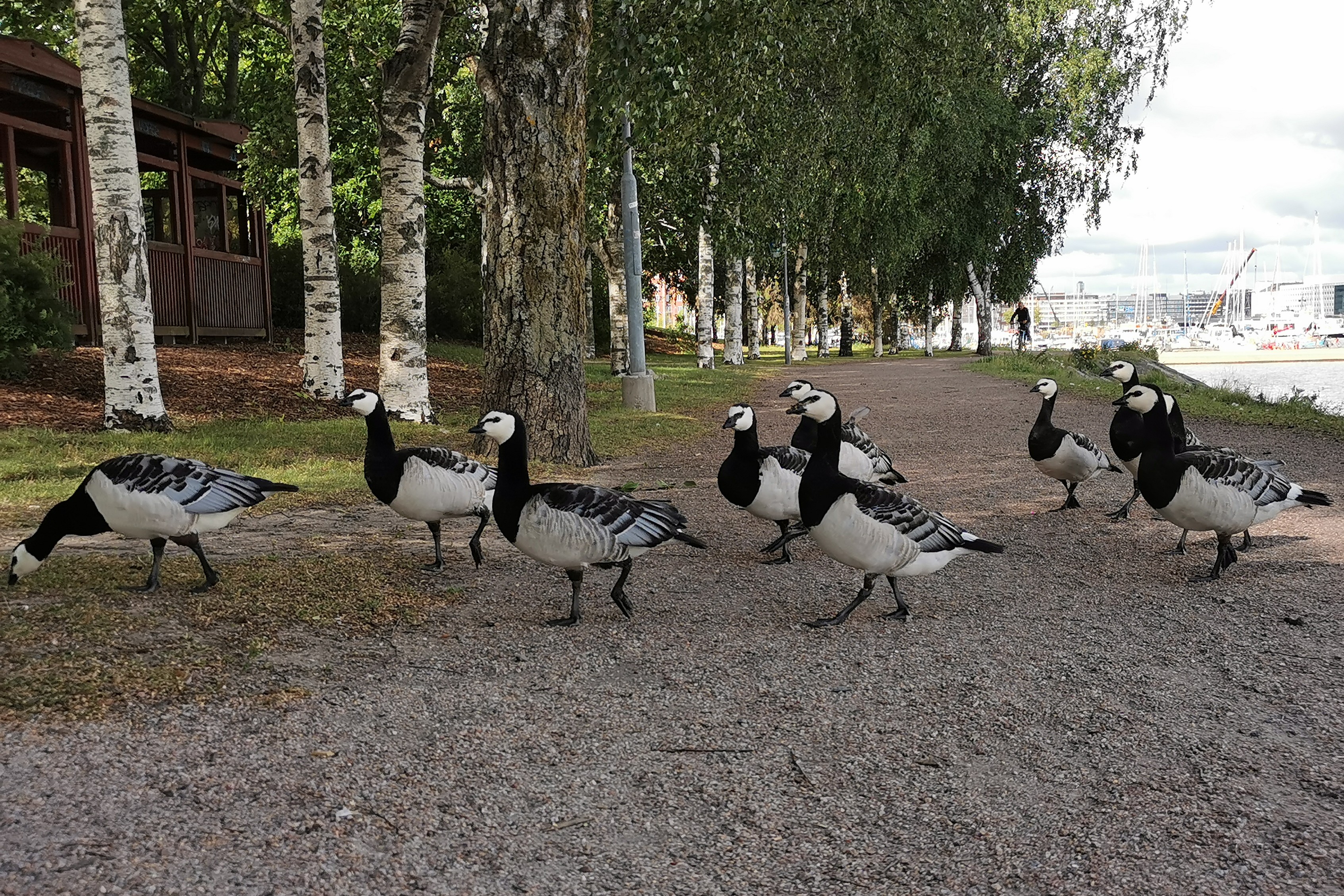 Valkoposkihanhet pesivät Helsingin ja Espoon saaristossa ja tuovat poikasensa kesä-heinäkuussa kaupungin nurmikoille ruokailemaan. Valtaosa poikasista saavuttaa lentokykynsä heinä-elokuun vaihteessa, jolloin osa hanhista siirtyy ruokailemaan sisämaan puistoihin ja peltoalueille.