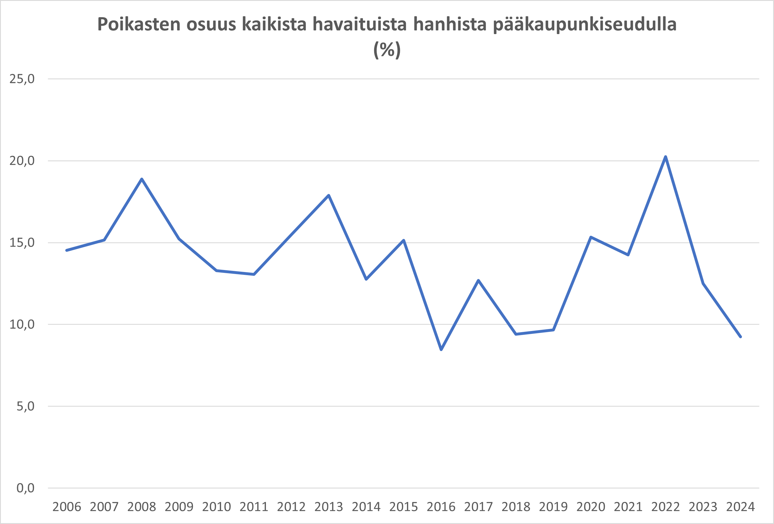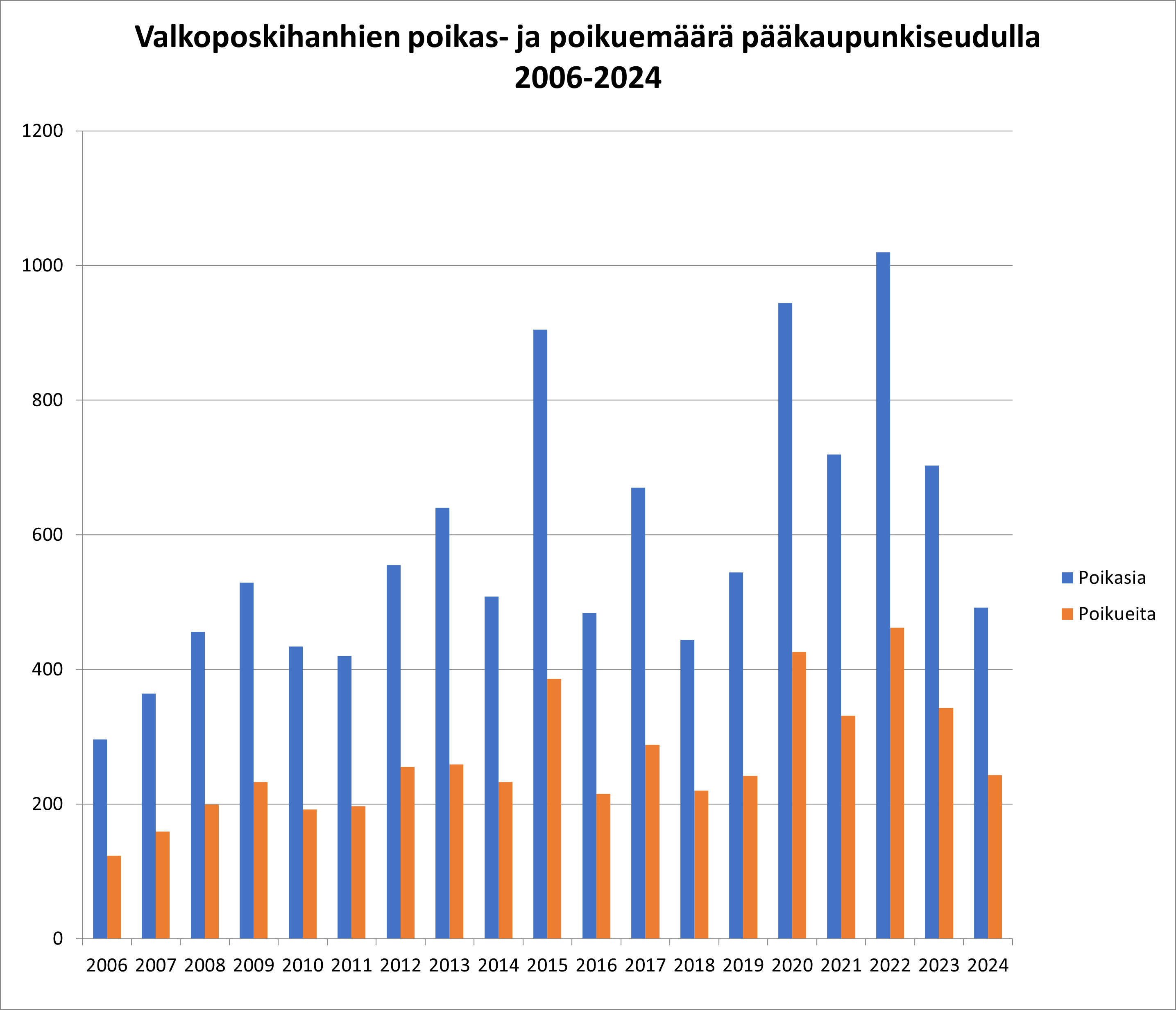 Pääkaupunkiseudun valkoposkihanhien kokonaismäärä laski edellisvuodesta hieman, mutta poikasten ja poikueiden määrä laski 30 prosenttia. Poikasten väheneminen johtui todennäköisesti ainakin osin kevään ja alkukesän vaihtelevista sääolosuhteista. Tulokset perustuvat Suomen ympäristökeskuksen kesäseurantaan. Vuosittainen poikueiden seuranta on laajentunut Turun seudulle, Lahteen, Kotkaan, Haminaan ja Parikkalaan.