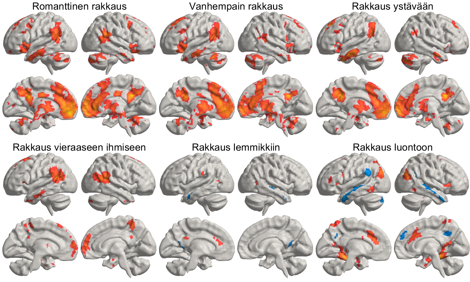 Aalto-yliopiston tutkijat kartoittivat millaista aivotoimintaa kuusi eri rakkauden lajia saa aikaan. Aivot aktivoituvat rakkaudesta läheisiä kohtaan erityisesti palkintojärjestelmän ja sosiaalisen aivotoiminnan alueilla.