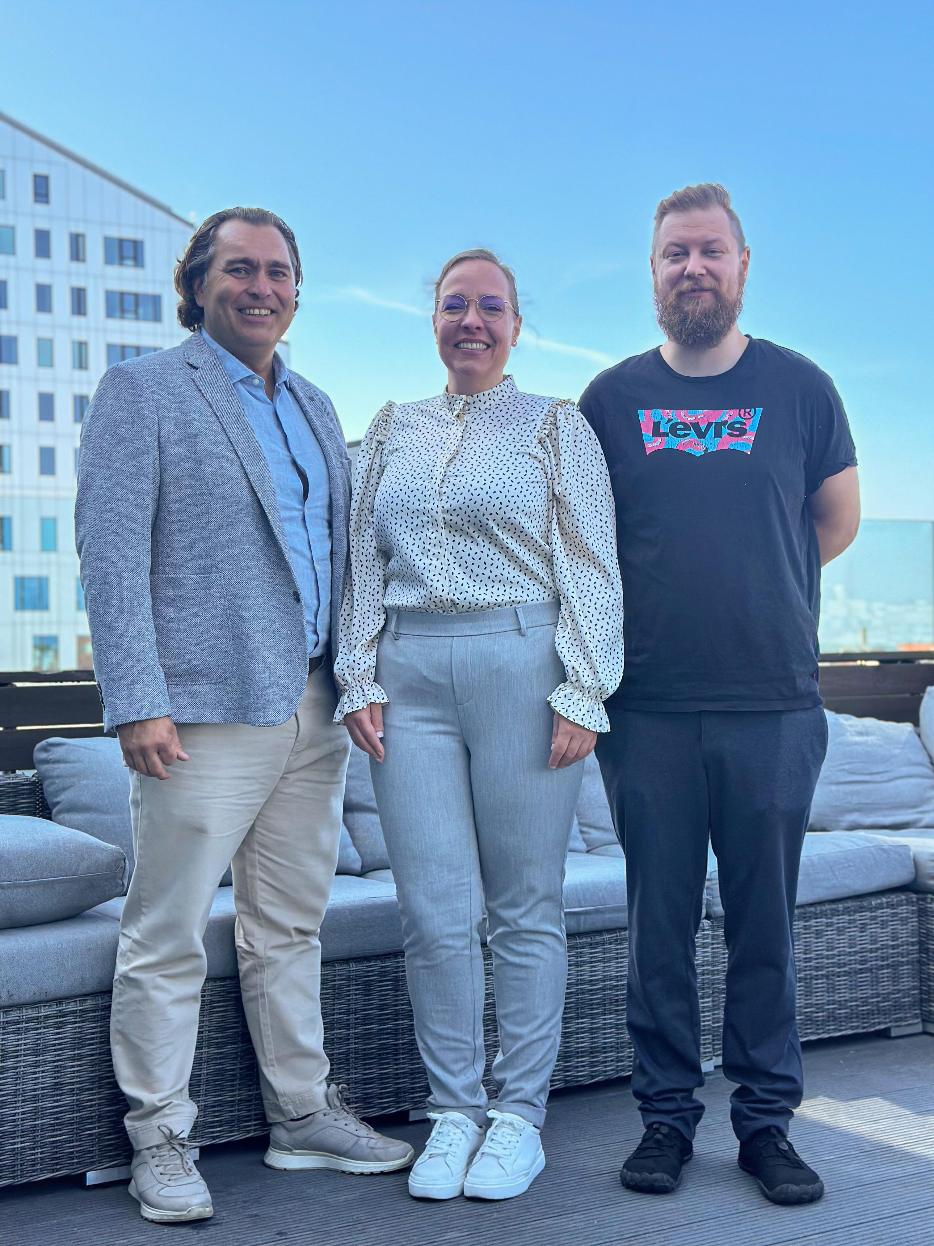 Kuvassa SARAn hallituksen puheenjohtaja Tino Nurmi (vas.), uusi toimitusjohtaja Salla Echardt sekä liiketoimintajohtajana jatkava Timo Kamppuri. Niko Kautonen