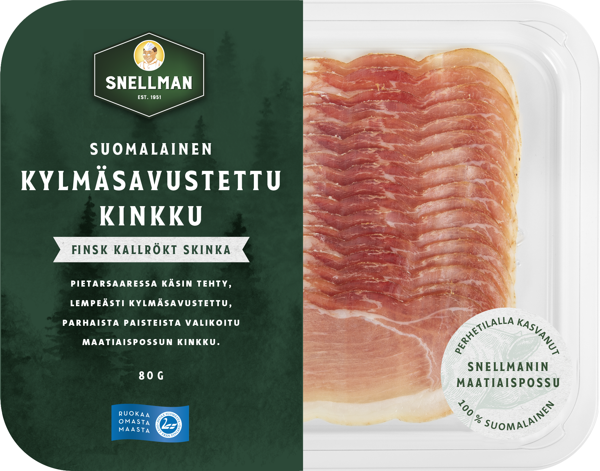 – Det har krävts oerhört mycket arbete för att komma i mål med det här projektet, men slutresultatet gör att det har varit mödan värt. Speciellt utvalda skinkor av vår inhemska lantgris ger oss en struktur som är mjuk, skivorna som är läckert tunna och en smak som är balanserad, konstaterar en belåten Kim Finne.