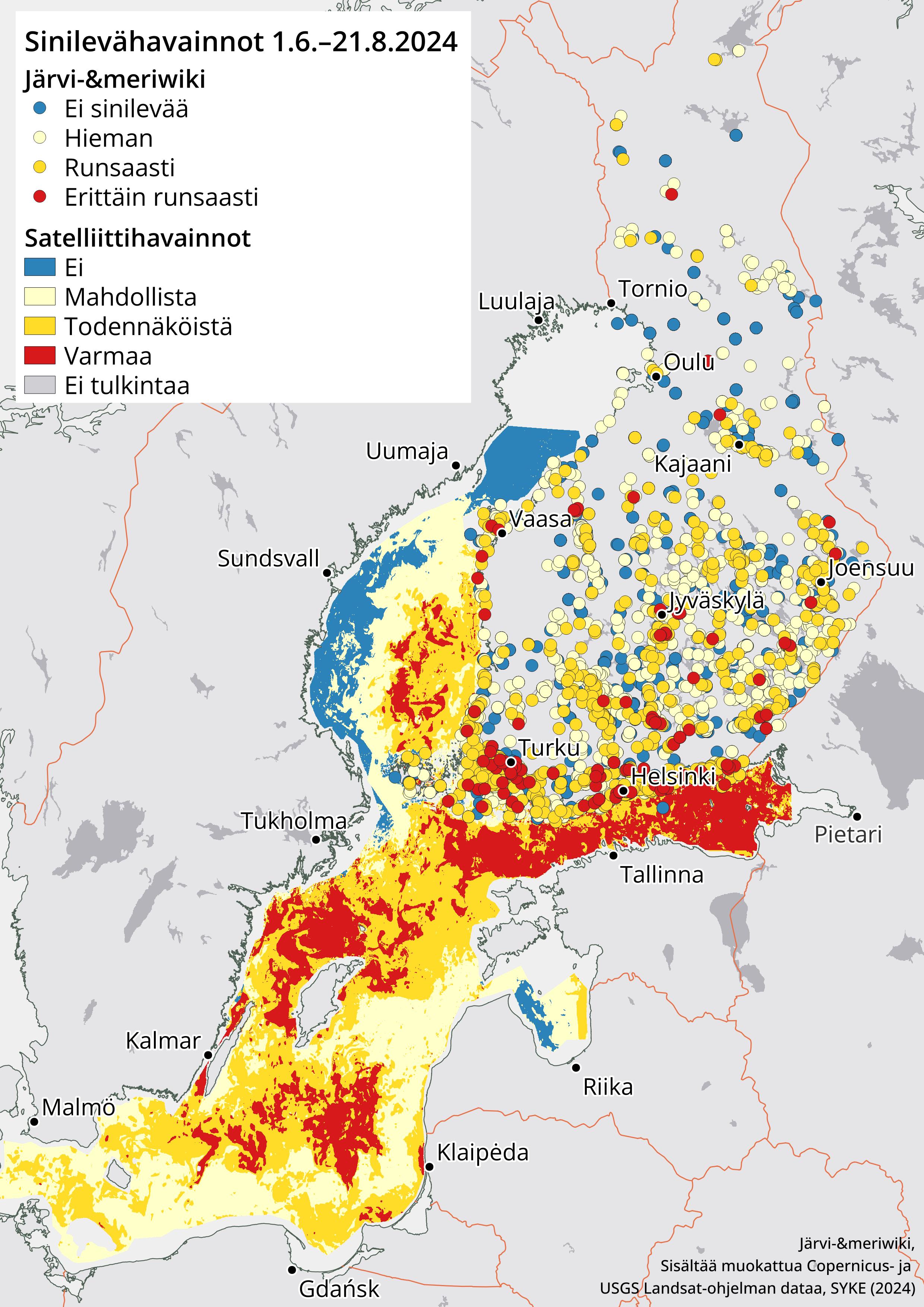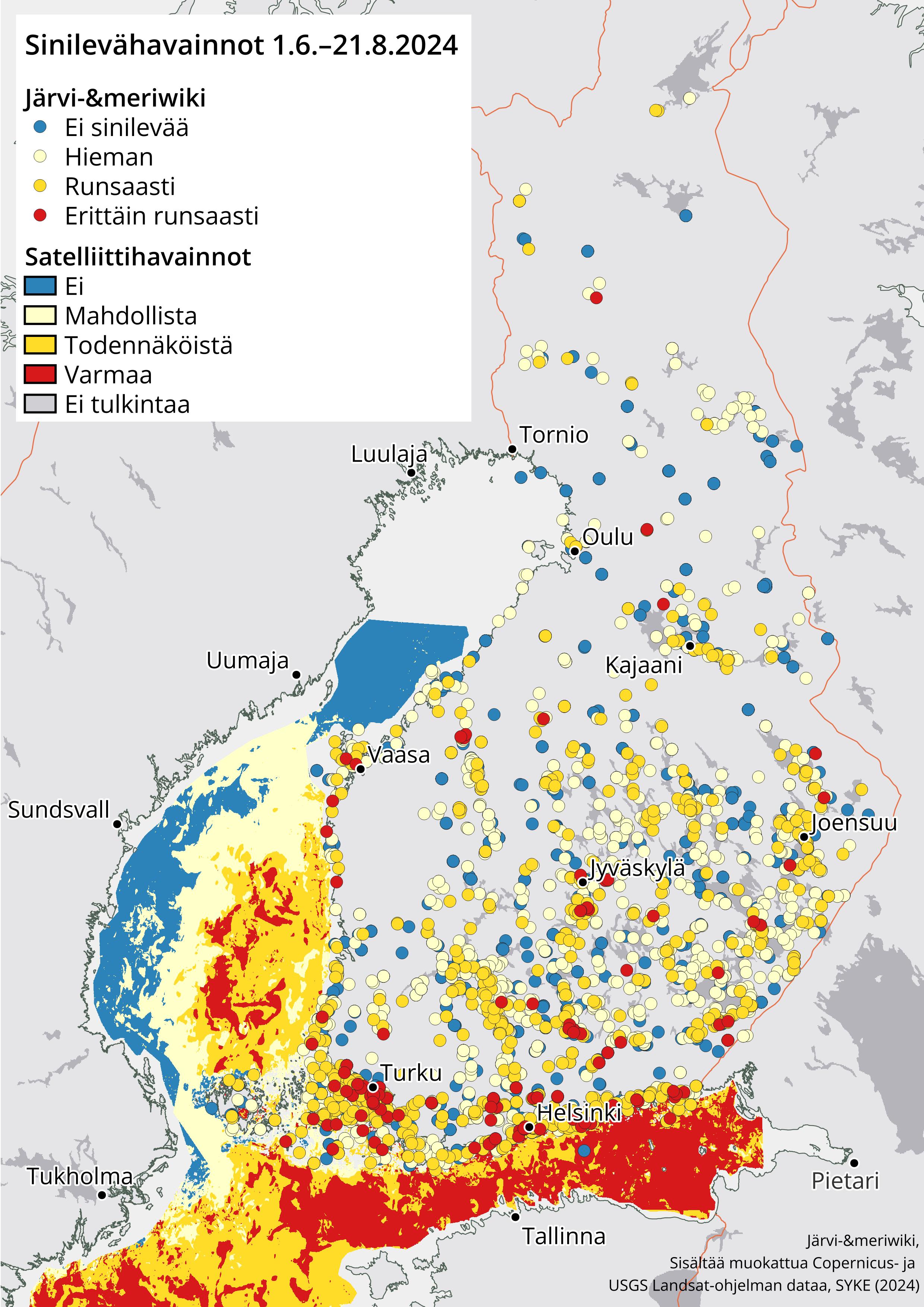 Valtakunnallisen sinileväkatsauksen yhteenveto kesä-elokuu 2024: Sinileväkukintoja havaittiin tänä vuonna erityisesti avomerialueilla ja rannikoilla, sisävesillä sinilevätilanne oli vaihteleva