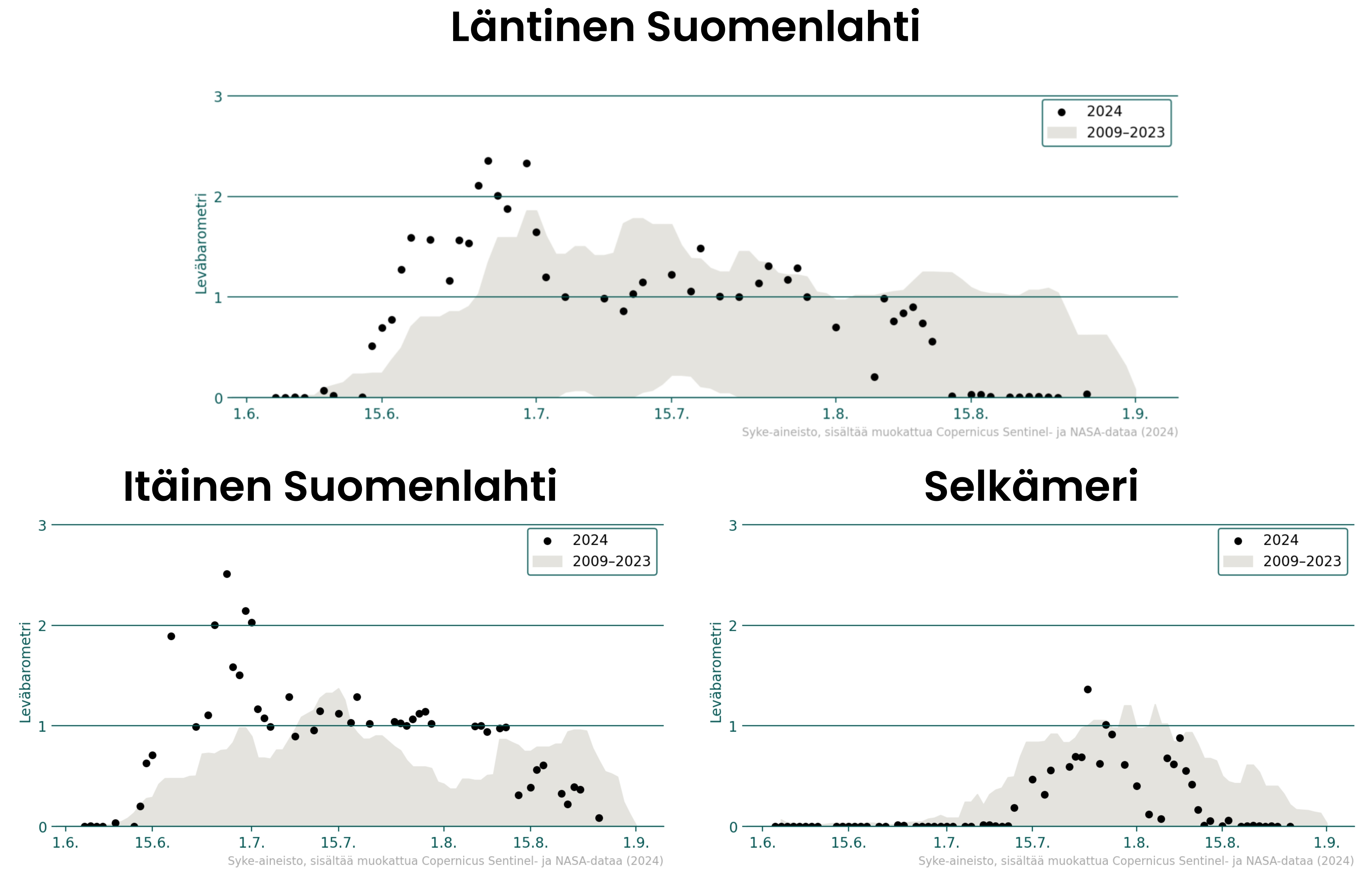 Avomerialueiden sinilevätilannetta voi seurata Tarkka-palvelun satelliittiaineistosta koostettujen sinileväbarometrien avulla. Barometrissa kuluvan vuoden havainnot on merkitty mustina pisteinä. Harmaa taustaväri kuvaa vuosien 2009–2023 havaintojen vaihteluvälin, johon ei sisälly poikkeavan suuret yksittäiset havainnot.