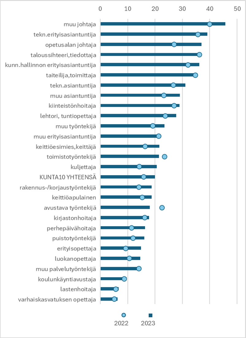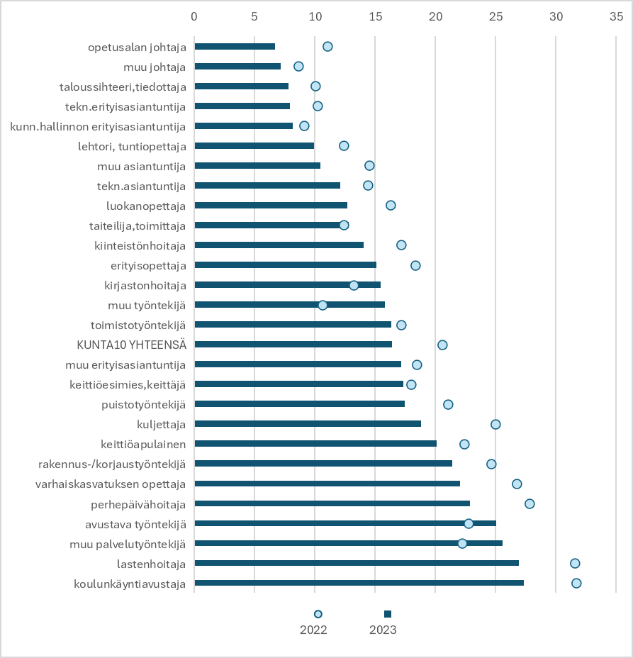 Työterveyslaitoksen Kunta10-tutkimuksessa on seurattu 11 kunnan työntekijöiden sairauspoissaoloja vuodesta 2000 alkaen. Sote-uudistus vei vuoden 2023 alussa sosiaali-, terveys- ja pelastusalojen työntekijät suurelta osin pois kuntien palkkalistoilta. Suurimmat ammattiryhmät kunnissa ovat nykyään esimerkiksi koulujen ja varhaiskasvatuksen opettajat, joiden määrä tutkimusaineistossa on pysynyt suhteellisen muuttumattomana.
