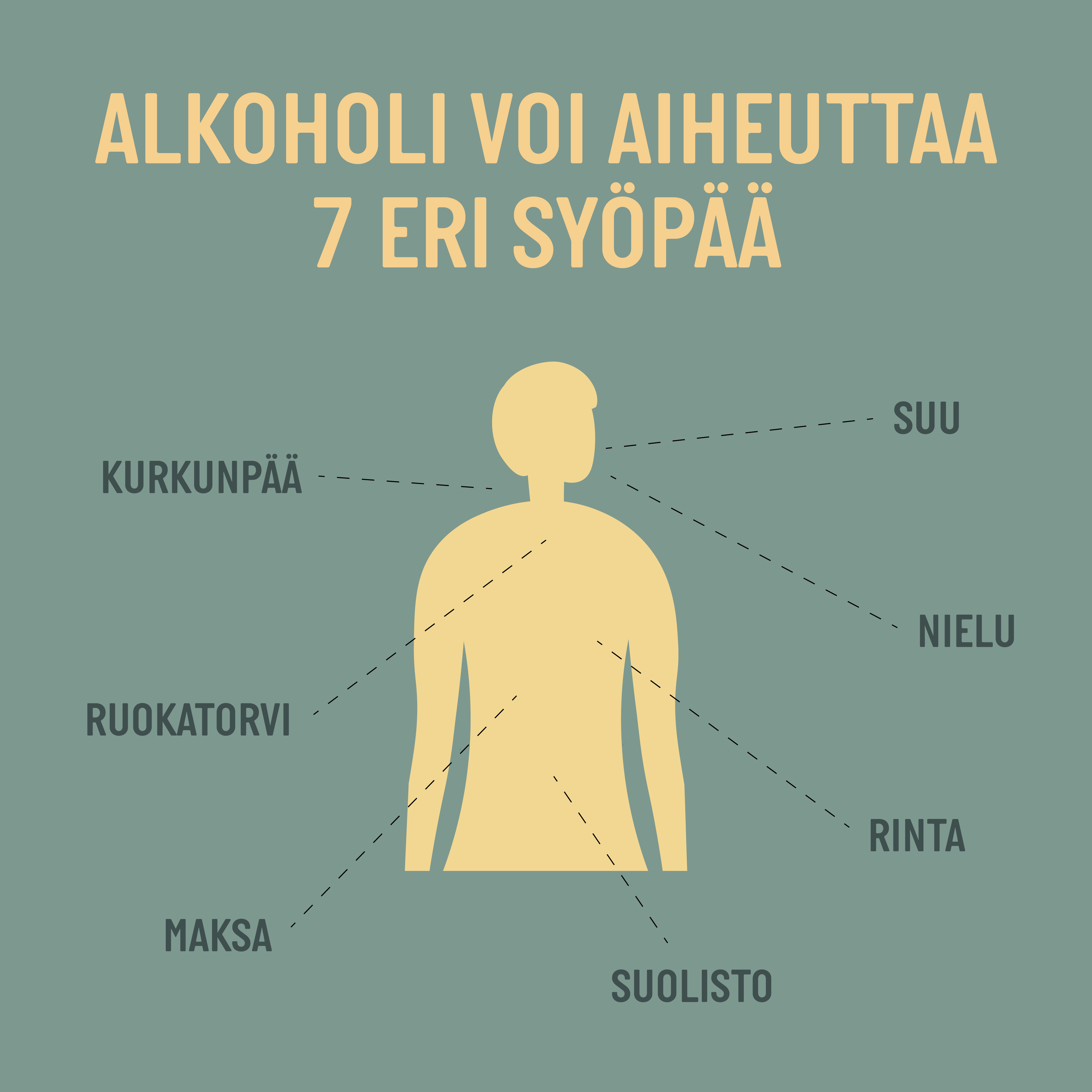 Alkoholi aiheuttaa seitsemää eri syöpätyyppiä – suun, nielun, kurkunpään ja ruokatorven syöpiä, maksasyöpää, suolistosyöpää sekä rintasyöpää. Vuonna 2020 alkoholinkäytön arvioitiin aiheuttavan yli 100 000 uutta syöpätapausta EU:ssa. Samaisena vuonna Suomessa alkoholin on arvioitu aiheuttaneen yli 2 100 syöpätapausta ja yli 500 syöpäkuolemaa.