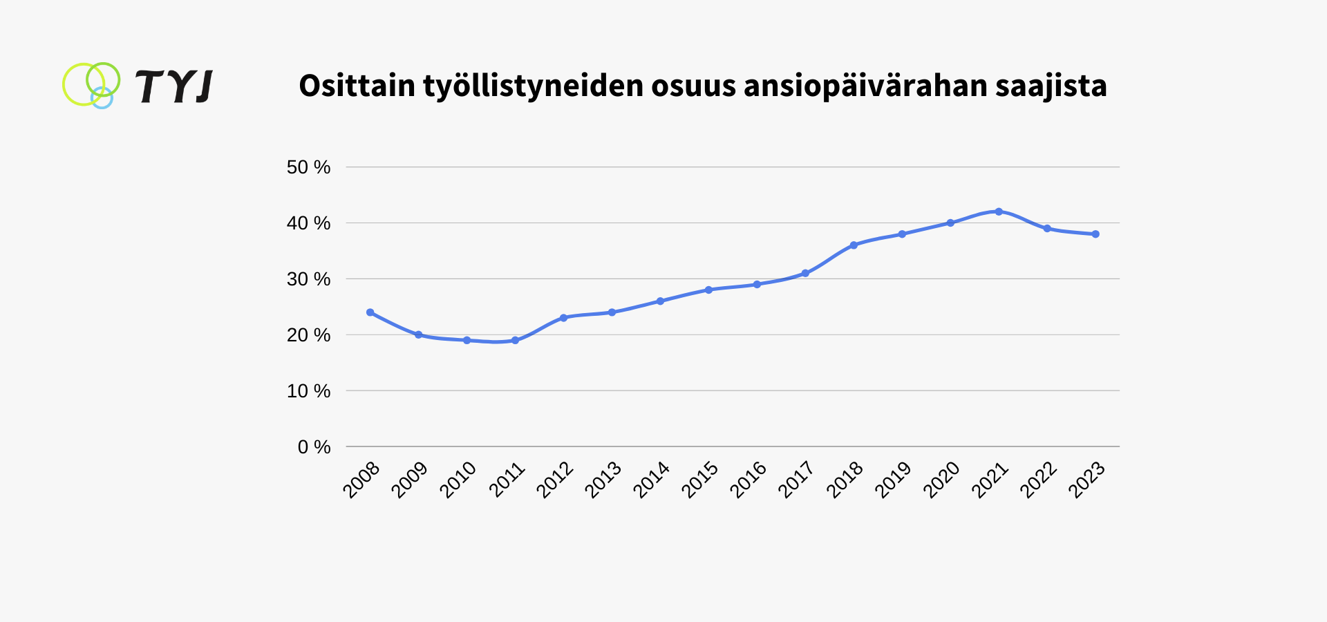 Osittainen työskentely ansiosidonnaisella on yleistä. Viime vuonna 99 000 henkilöä sai päivärahaa, jossa oli huomioitu työtulon vaikutus. Tämä tarkoittaa 38 % kaikista ansiosidonnaisen saajista.