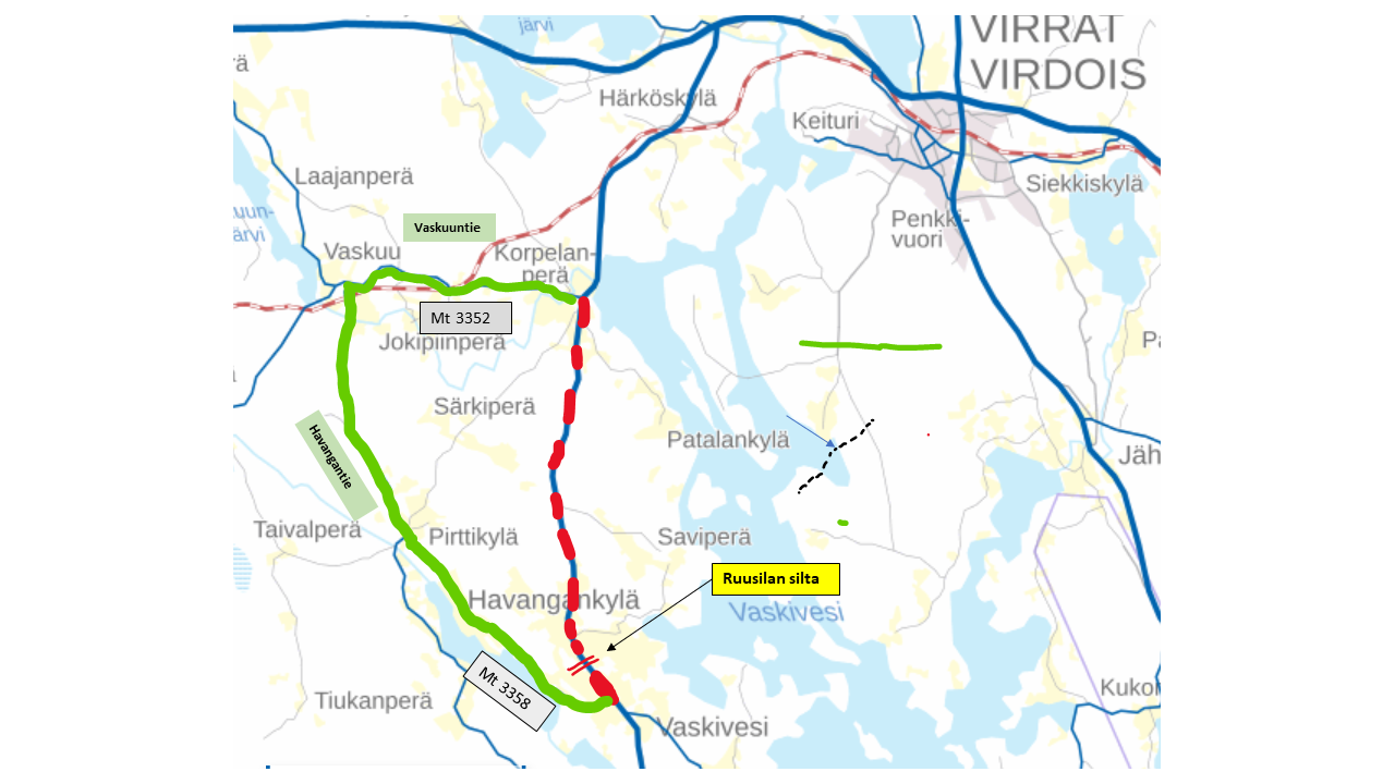 Vaskivedentie Virroilla poikki Ruusilan siltatyömaan vuoksi