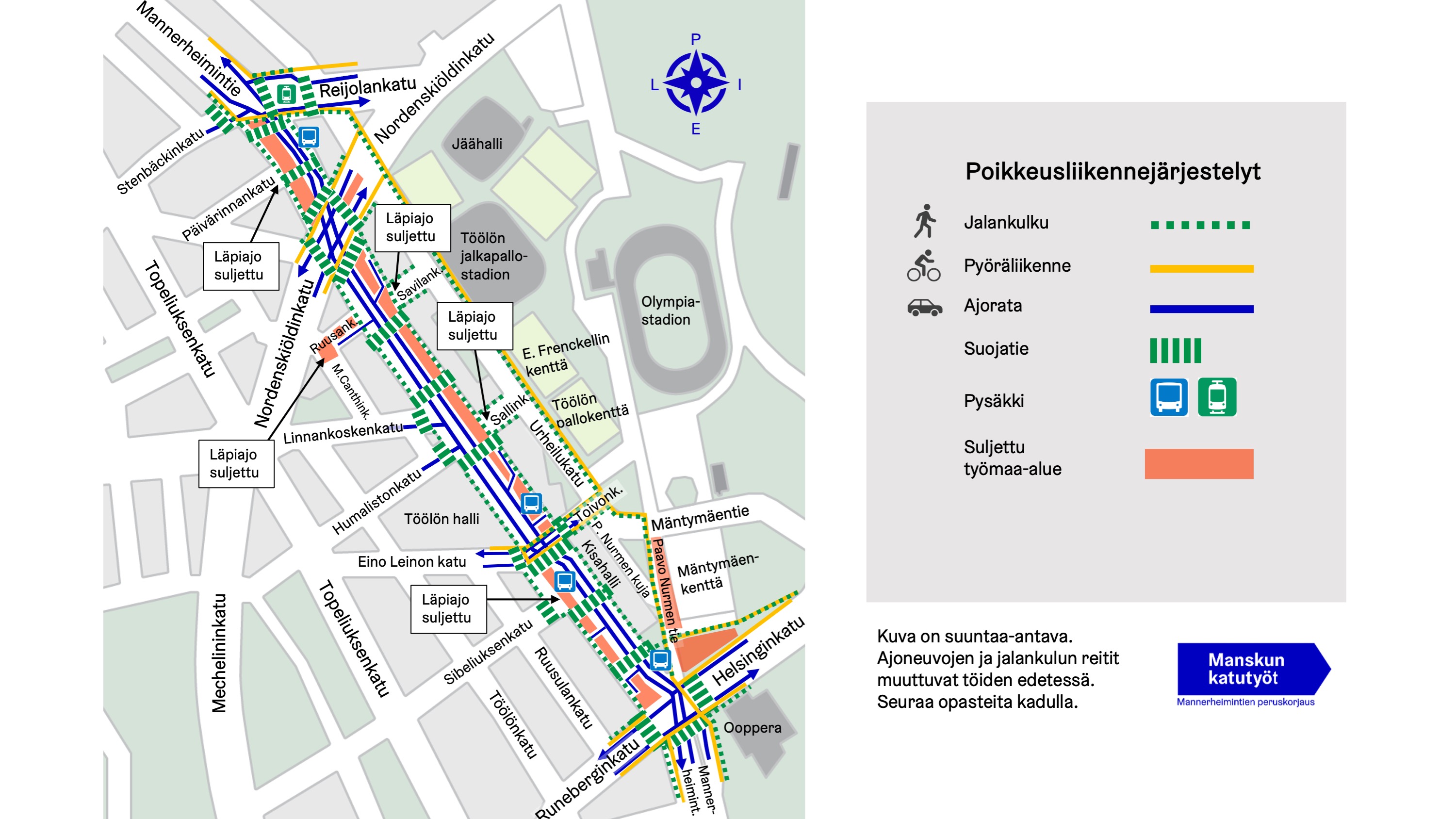 - Jalkakäytävät Mannerheimintien molemmin puolin säilyvät käytössä remontin alkuvaiheessa.
