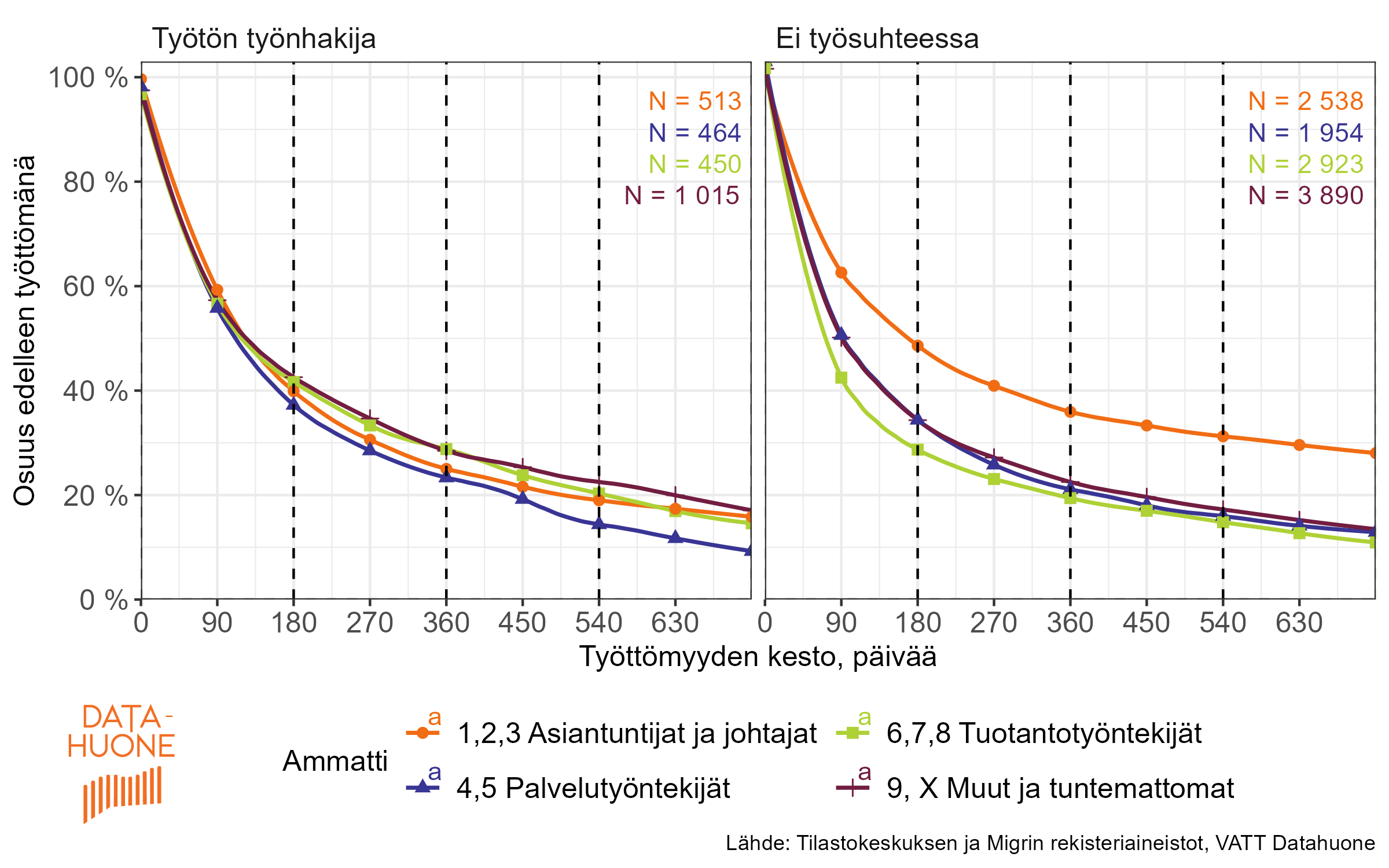 Työperusteisesti Suomessa oleskelevien reilun 20 000 palkansaajan joukossa työsuhde loppuu vuosittain noin joka kymmenennellä. Työttömäksi työnhakijaksi rekisteröityminen on harvinaisempaa. “Työperusteisesti Suomessa olevien työttömyysjaksot kestivät usein kauemmin kuin kolme tai kuusi kuukautta”, kertoo erikoistutkija Juho Alasalmi Datahuoneelta.