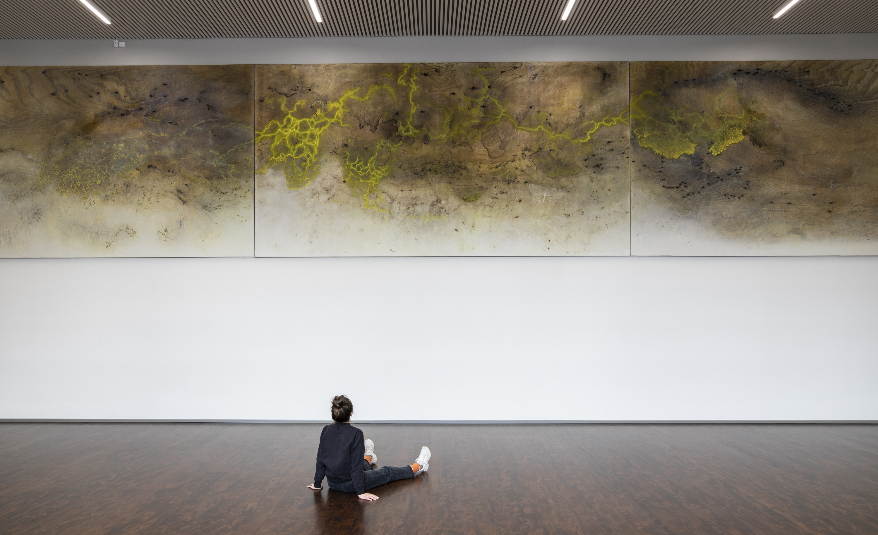 Visual artist Alma Heikkilä’s work draws attention to the interrelations we are entirely dependent on. For Käpylä Comprehensive School’s Väinölä building, Heikkilä created a two-part work called (+,+) soil, pore space, hyphae, phaneroplasmodium, small white wave, cells and cell clusters. The work creates a connection between humans, non-humans, and the environment by revealing the underground and microscopic life that can be only partially experienced through the human sensorium. The monumental painting dominating the multifunctional hall displays bacteria, microbiological growth, fungi, mycelia, and roots as large organic masses and small details. In a smaller relief, the themes are connected to the scale and shape of the human body. With her work, Heikkilä wanted to take part in the tradition of educational posters and monumental paintings in schools. Pupils get to see the work after autumn break, when the school’s renovation will be completed.