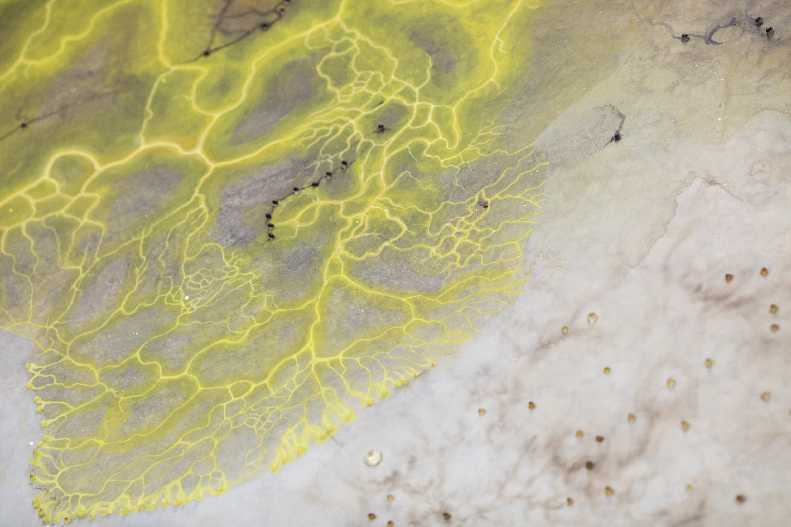 Ink and pigments on canvas as well as plaster and epoxy resin are the main materials in Alma Heikkilä’s works. Heikkilä participated in the 2023 Helsinki Biennial with a spatial work on Vallisaari Island. In her art, Heikkilä explores interactions and scales beyond human comprehension.
