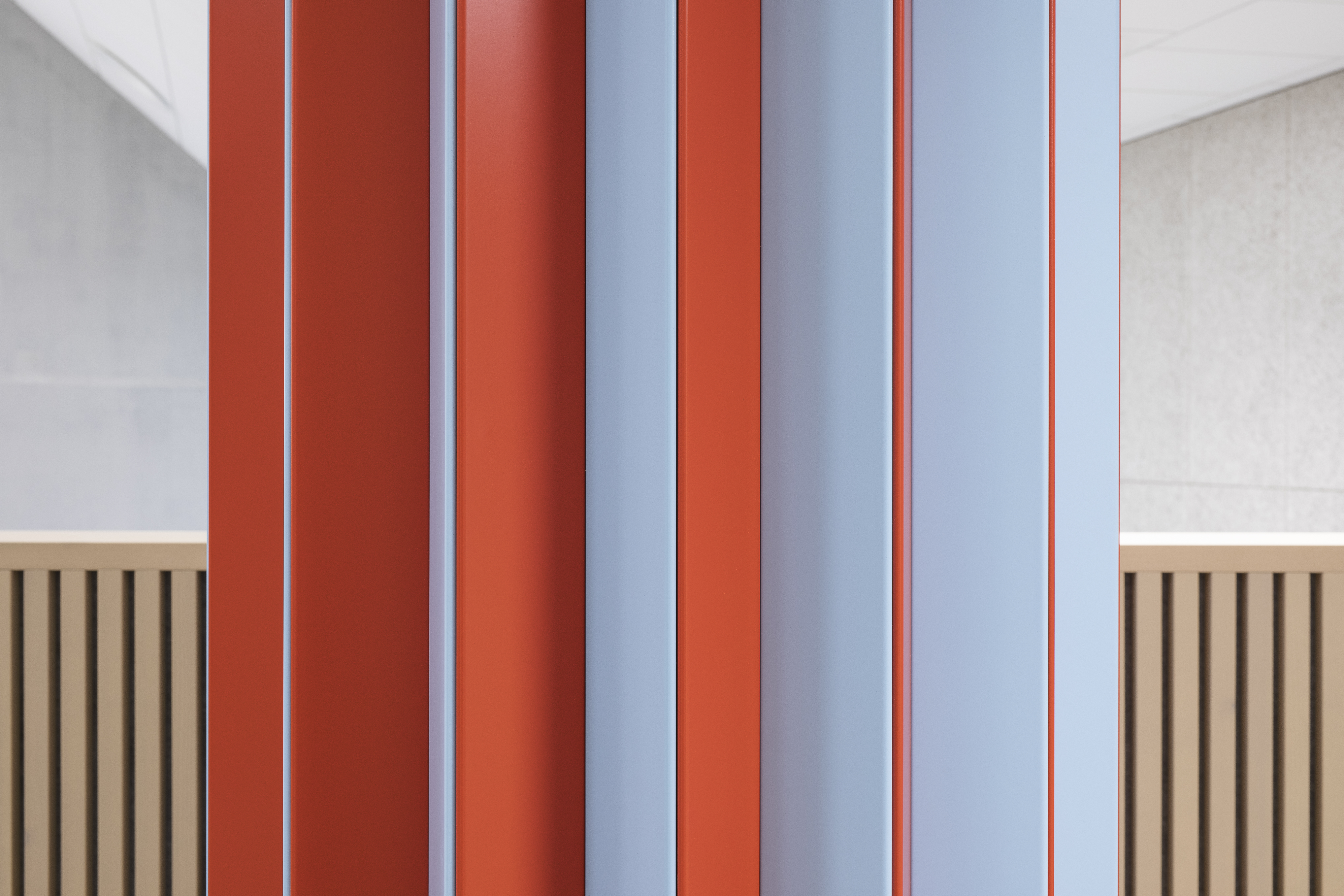Visual artist Inka Bell’s work, Around, is a play of colour, form, and architecture. The work for Pakila Primary School and Daycare Eloisa on Elontie Street is installed on a column in the cafeteria. Blue and rust-coloured triangular steel elements twine around the column that runs through the building. The rhythmic arrangement of colours, forms, and shadows stimulates vision and creates an impression of movement round the column. Additionally, Bell’s work brings the forms of ancient Greece and classical architecture’s fluting – the vertical grooves on columns – into the present day.