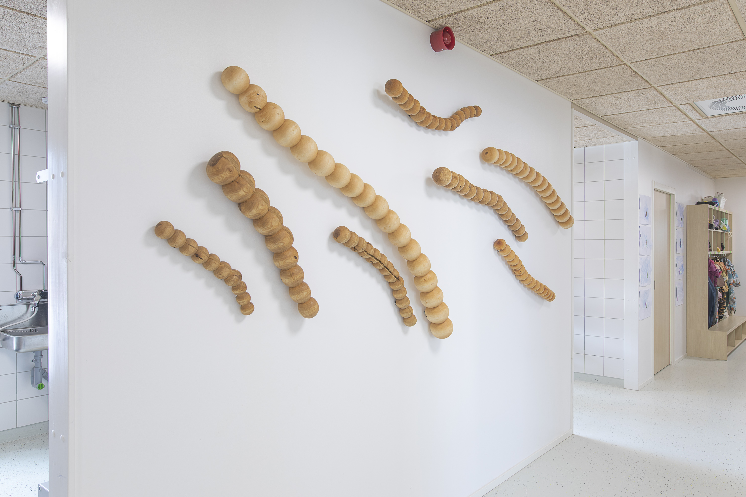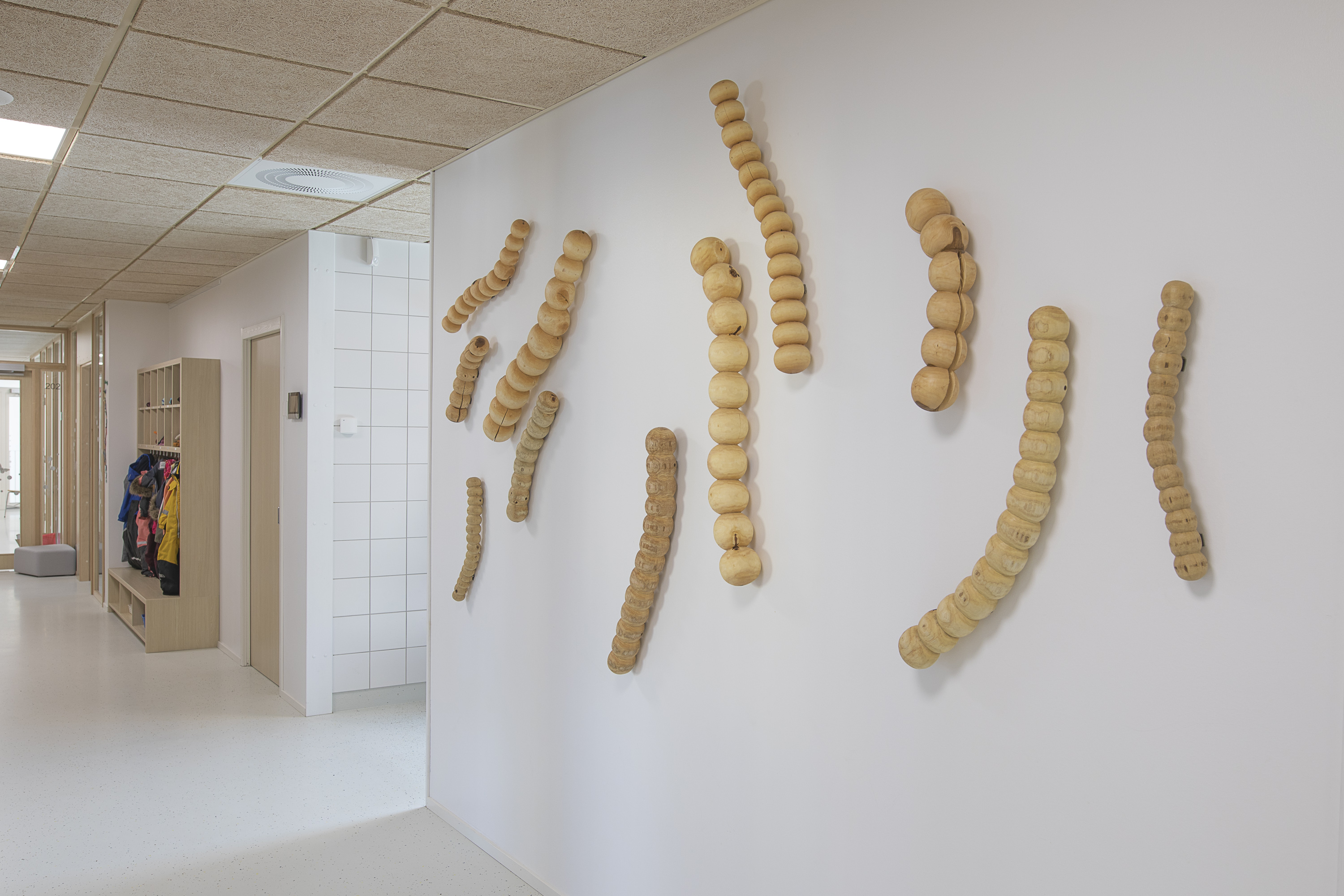 The artist Jan Lütjohann has created two installations of wooden sculptures for the Honkasuo daycare. The sculptures are made from curved pieces of reclaimed timber that Lütjohann has carved into repeating round shapes. The resulting ooooooo-shapes relate to ideas of repetition and quantity: annual growth rings of a tree, cycles of days and years, chains of events, or generations of trees, humans, and others. The sculptures are touchable and will age and change over time.