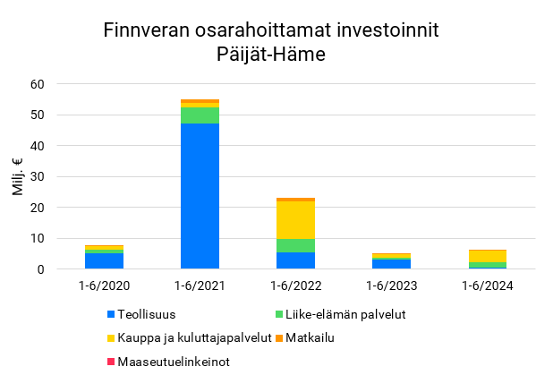 Finnveran yhdessä muiden rahoittajien kanssa rahoittamien kokonaishankkeiden määrä oli Päijät-Hämeessä 55 miljoonaa euroa (46). Siitä investointien osuus oli ainoastaan 6 miljoonaa (5), ja käyttöpääomatarpeiden osuus 11 miljoonaa (10).