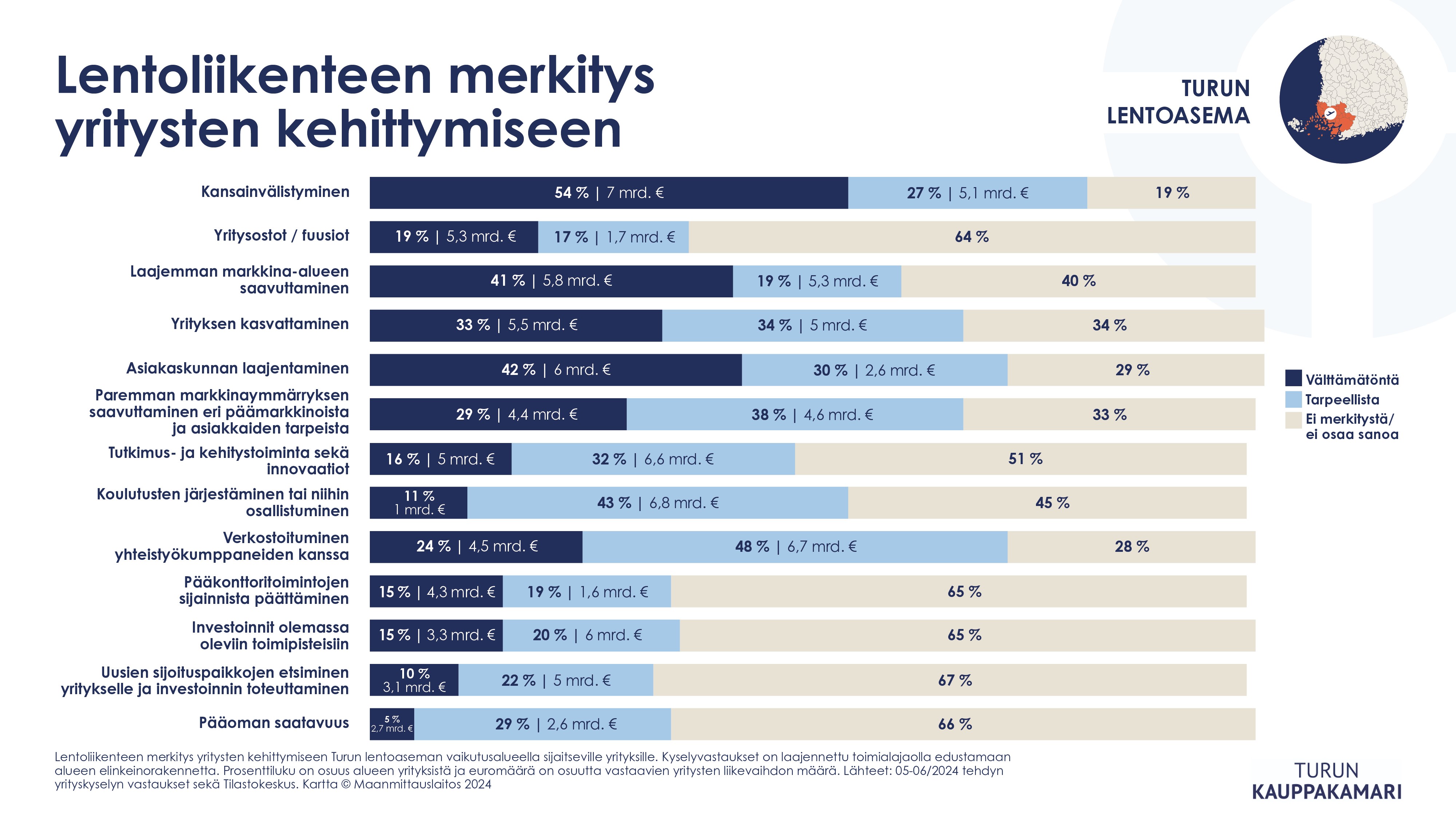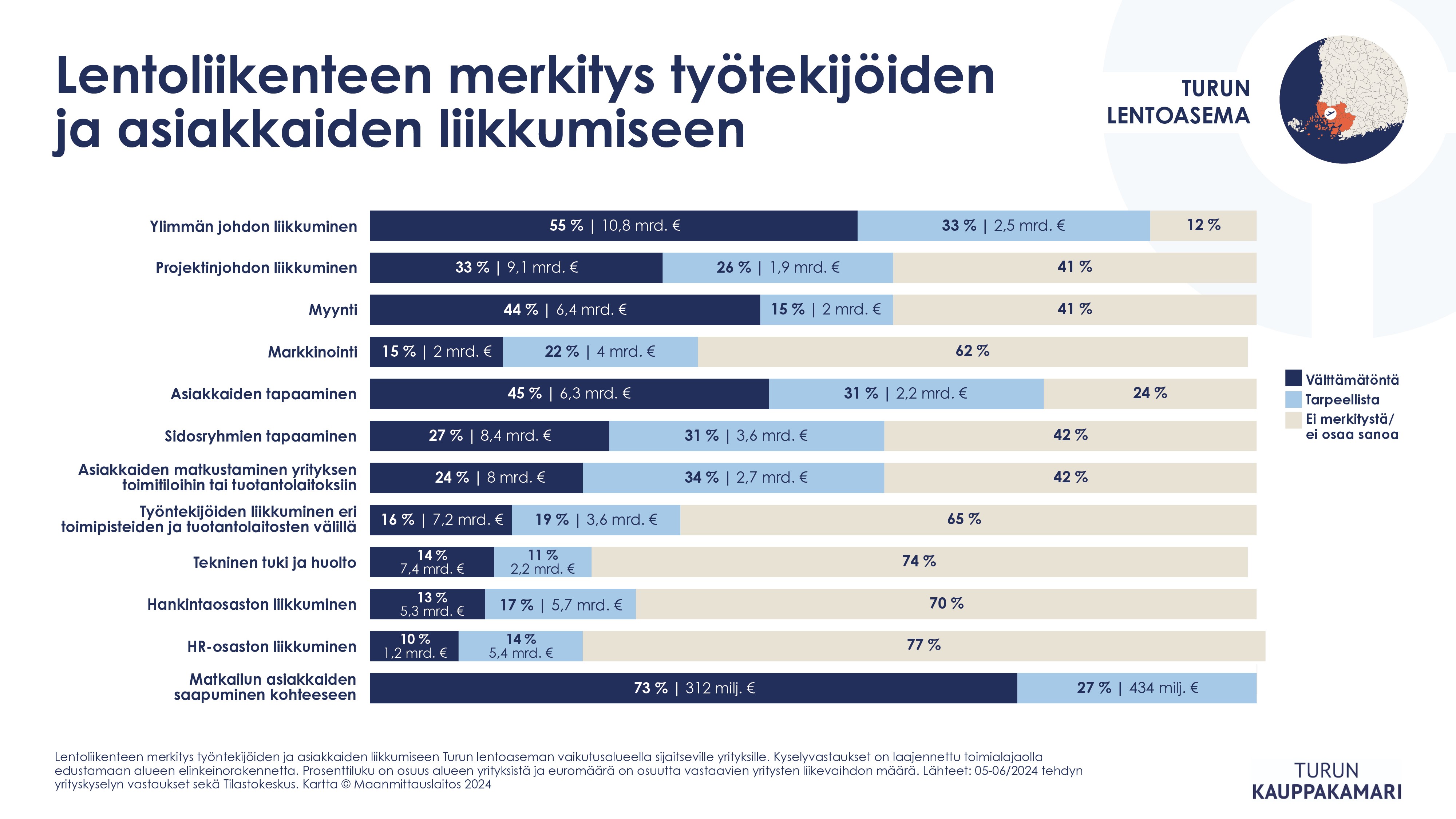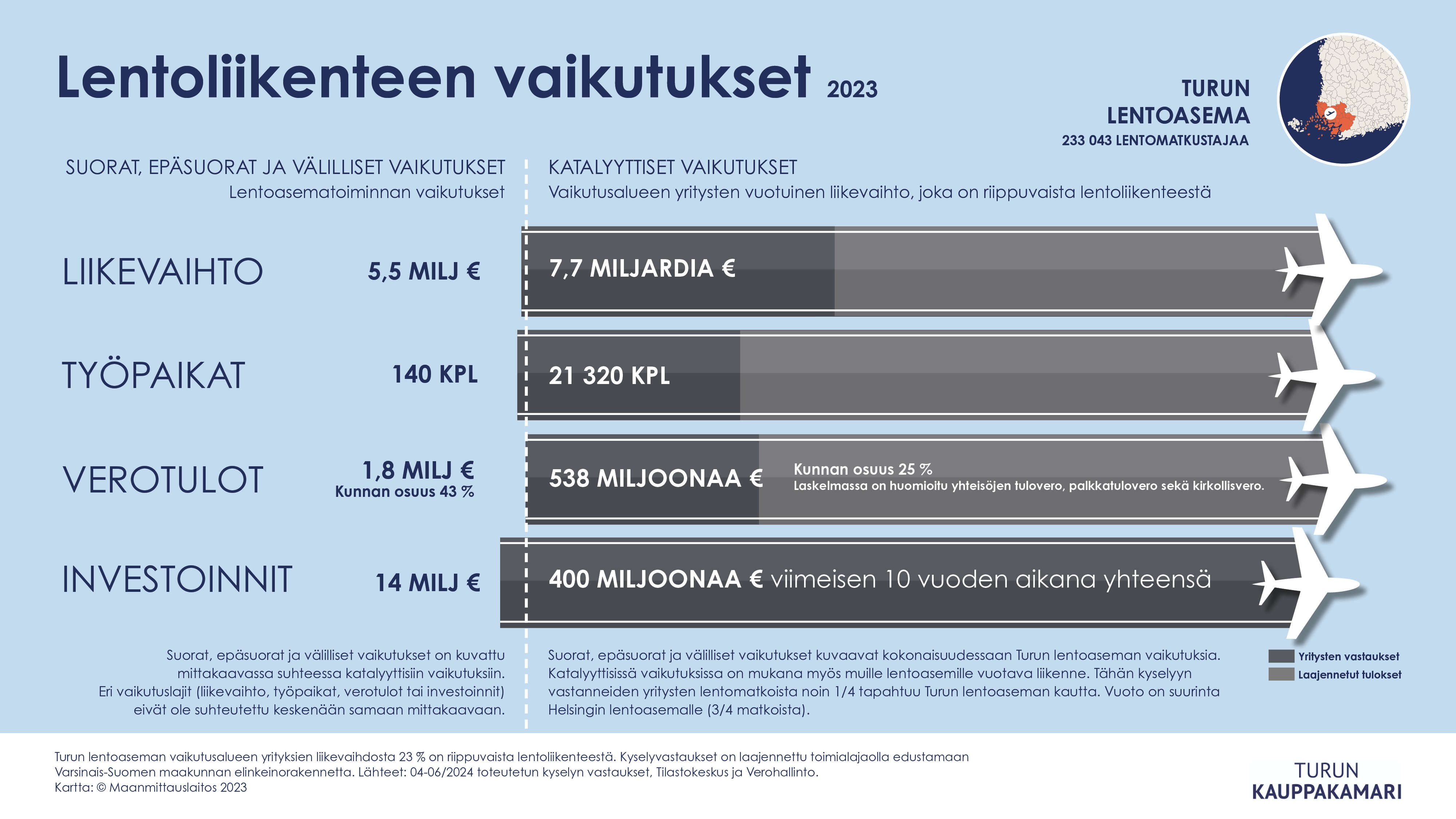 Lentoliikenteen taloudelliset vaikutukset ovat Varsinais-Suomen kasvulle ja menestykselle merkittävät. Lentoliikenteen aluetaloudellisia vaikutuksia selvittivät Turun kauppakamarin lisäksi seitsemän muuta alueellista kauppakamaria. Vastaavaa näin laajaa selvitystä ei ole aiemmin tehty. Selvityksessä mukana olleiden lentoasemien aluetaloudellinen merkitys on 38 miljardia euroa ja 96 000 työpaikkaa.