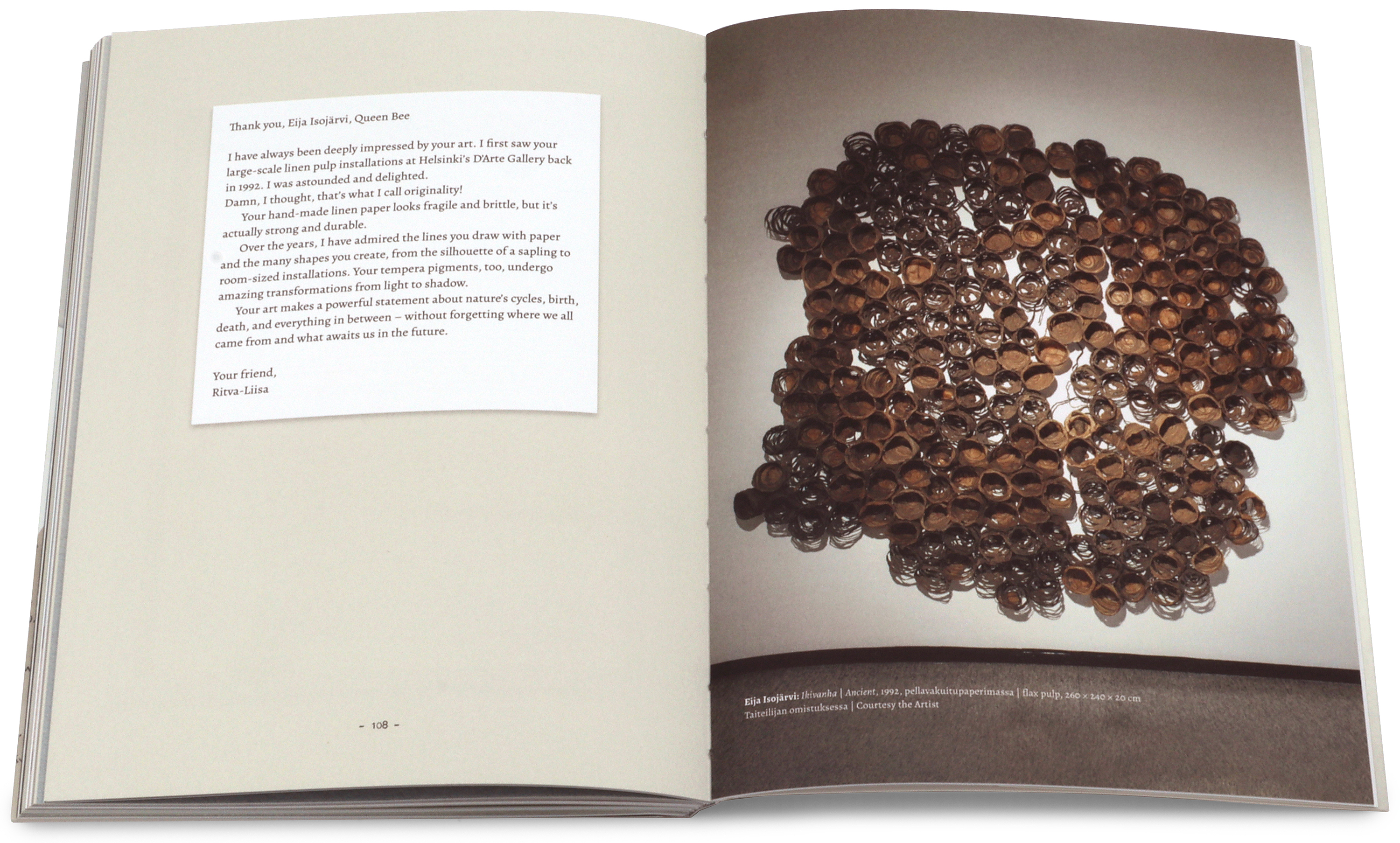 Kiitoskirjeitä-kirjassa lukija pääsee seuraamaan taiteilijoiden vuoropuhelua ja kurkistamaan taiteelliseen inspiraatioon paljaimmillaan. Kirjan toimittanut Serlachiuksen johtaja Pauli Sivonen. Kiitoskirjeitä-näyttelyn ovat kuratoineet valokuvataiteilija Elina Brotherus ja Serlachiuksen suunnittelupäällikkö Tarja Väätänen.