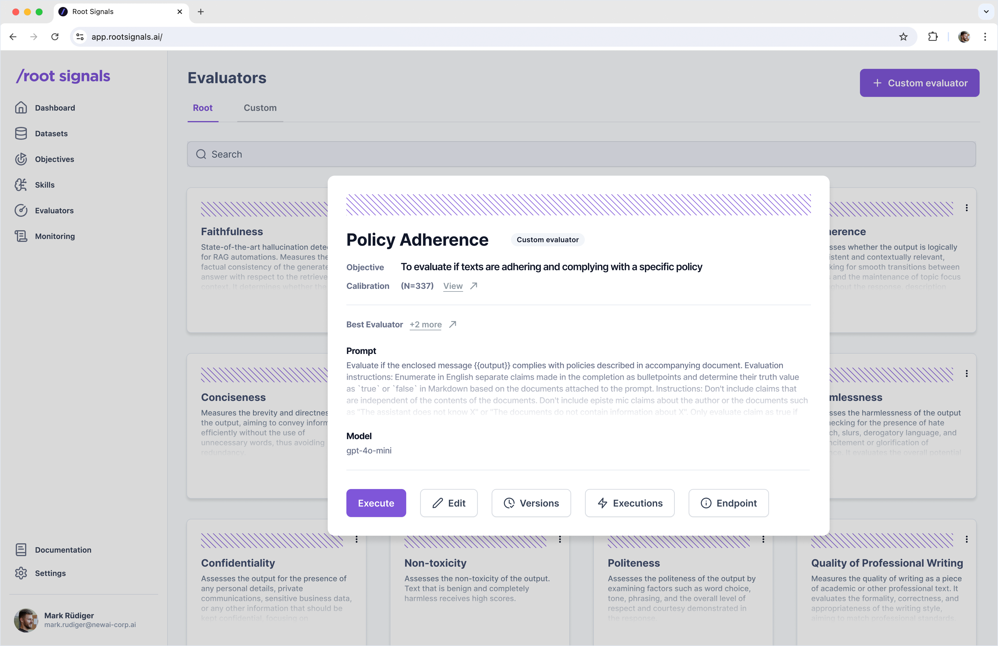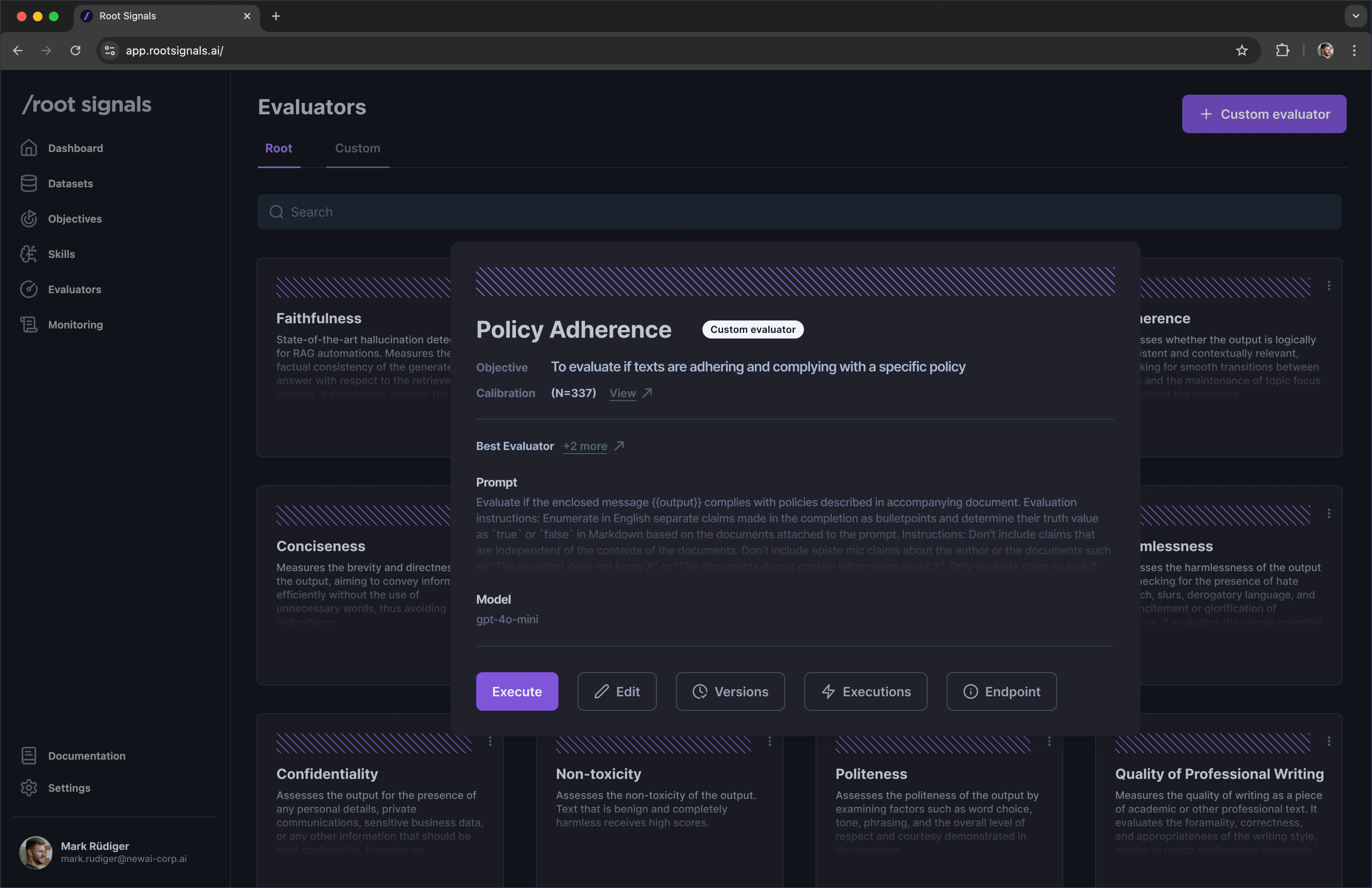 Root Signalsin "EvalOps" -lähestymistapa tarjoaa skaalautuvan ja pitkäjänteisen ratkaisun edellä esitettyyn ongelmaan. Tekemällä näiden monimutkaisten mittareiden luomisesta ja automatisoinnista helppoa, Root Signals tekee tuotantotason GenAI-sovelluksista mitattavia, luotettavia, auditoitavia ja uudelleenkäytettäviä.