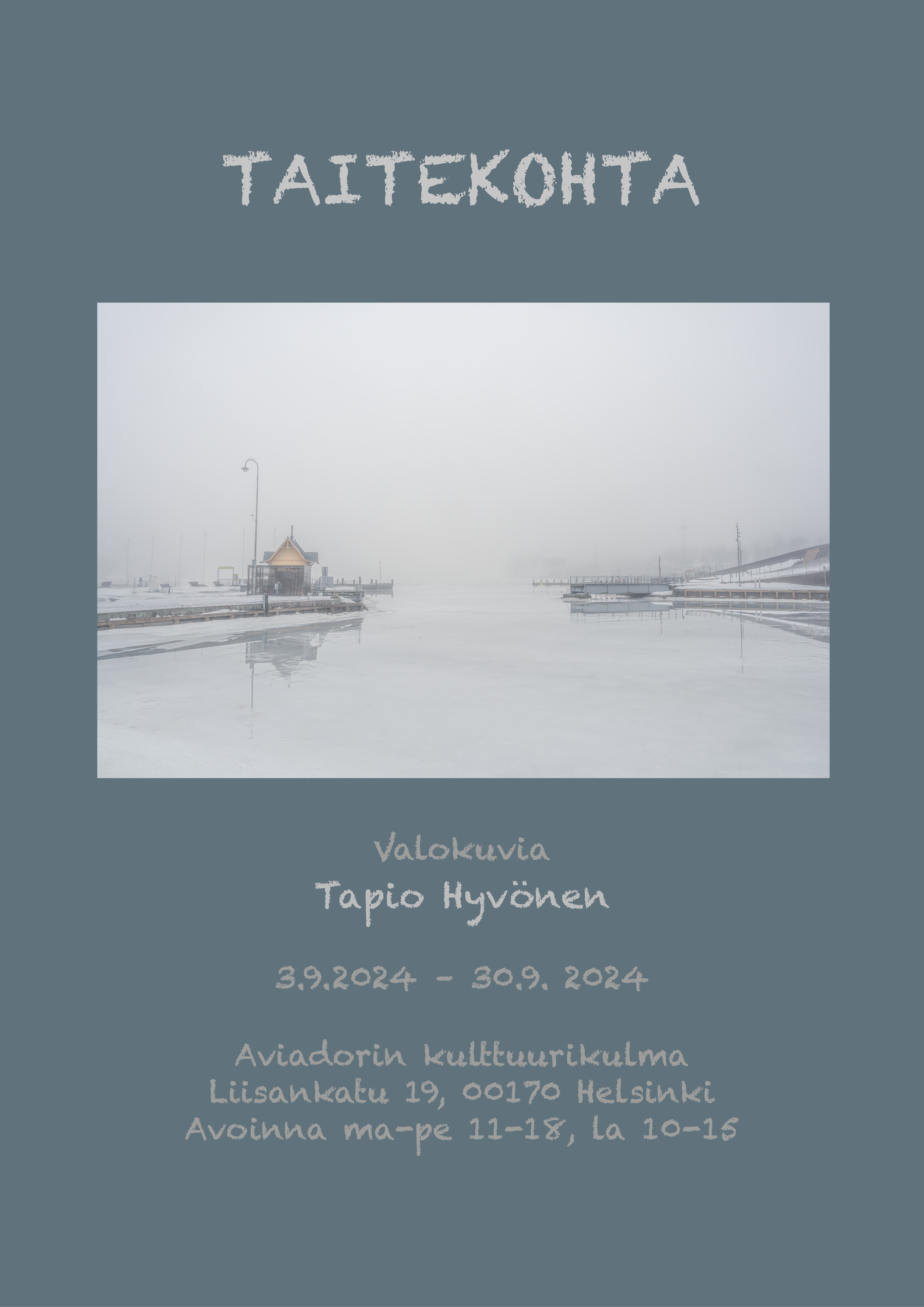Tapio Hyvösen Taitekohta-valokuvanäyttely on esillä Kulttuurikulmassa (Liisankatu 19, Helsinki) koko syyskuun ajan. Siihen pääsee tutustumaan vapaasti liikkeen aukioloaikoina: ma-pe klo 11–18 ja la klo 10–15.