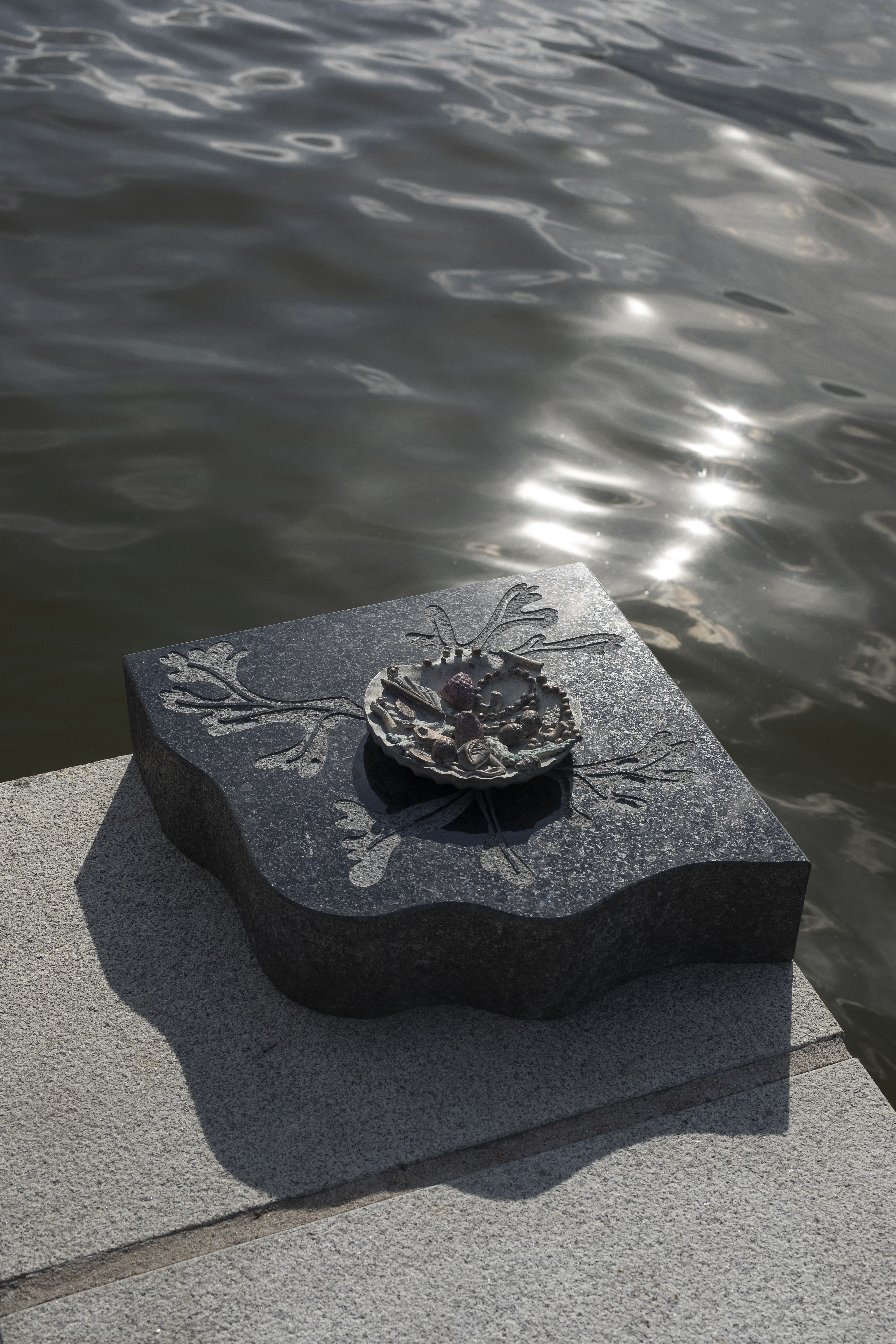 Hengähdys -teoksessa simpukka kannattelee huomassaan pientä esineistöä, seuranaan kaiverrettu rakkolevä ja säe ”Ajatus kutsuu luokseen toista”. Saareke tarjoaa piilopaikan veden tuntumassa. Heini Aho huomasi, että usein siellä seisoo yksi ihminen, merelle katsoen.