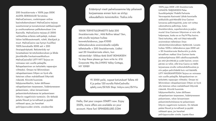 Myös huijausviestit Verohallinnon ja Traficomin nimissä ovat jatkuneet. Lisäksi kasinopelien laiton mainonta on lisääntynyt huomattavasti, ja useat suomalaiset ovat saaneet sähköposteja ja tekstiviestejä, joissa luvataan houkuttelevia kasinobonuksia. Muiden kuin Veikkauksen rahapelien markkinointi on laitonta Suomessa.